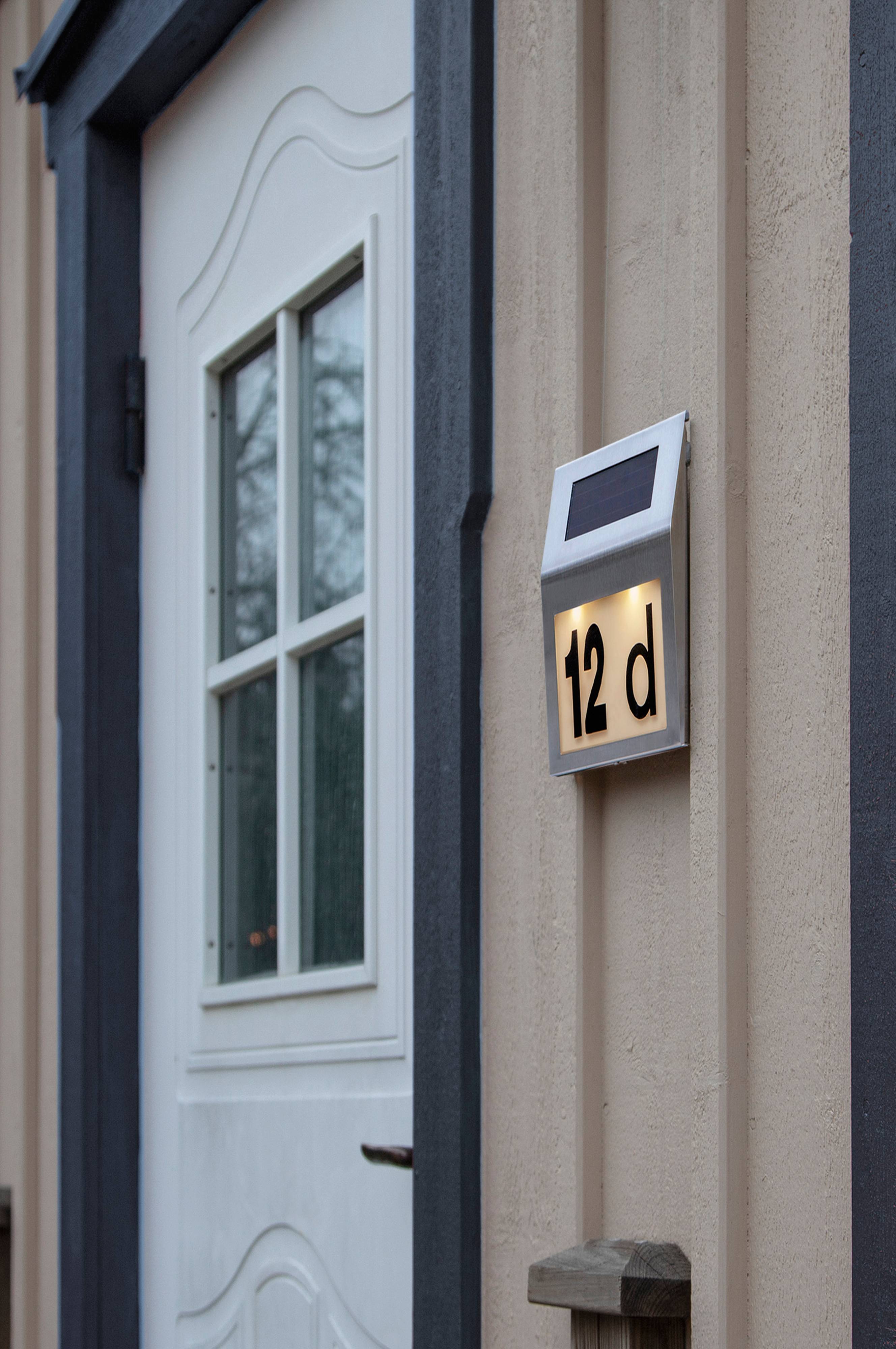 Solcelledrevet vægbelysning med mulighed for at sætte husnummer på. 3 sæt med tal 0-9 og 1 sæt med bogstaver a-n medfølger. Lyser op med hvidt skær om natten. Lysrelæ med 1 batteri som medfølger. Højde 20 cm, bredde 18 cm og dybde 3 cm.