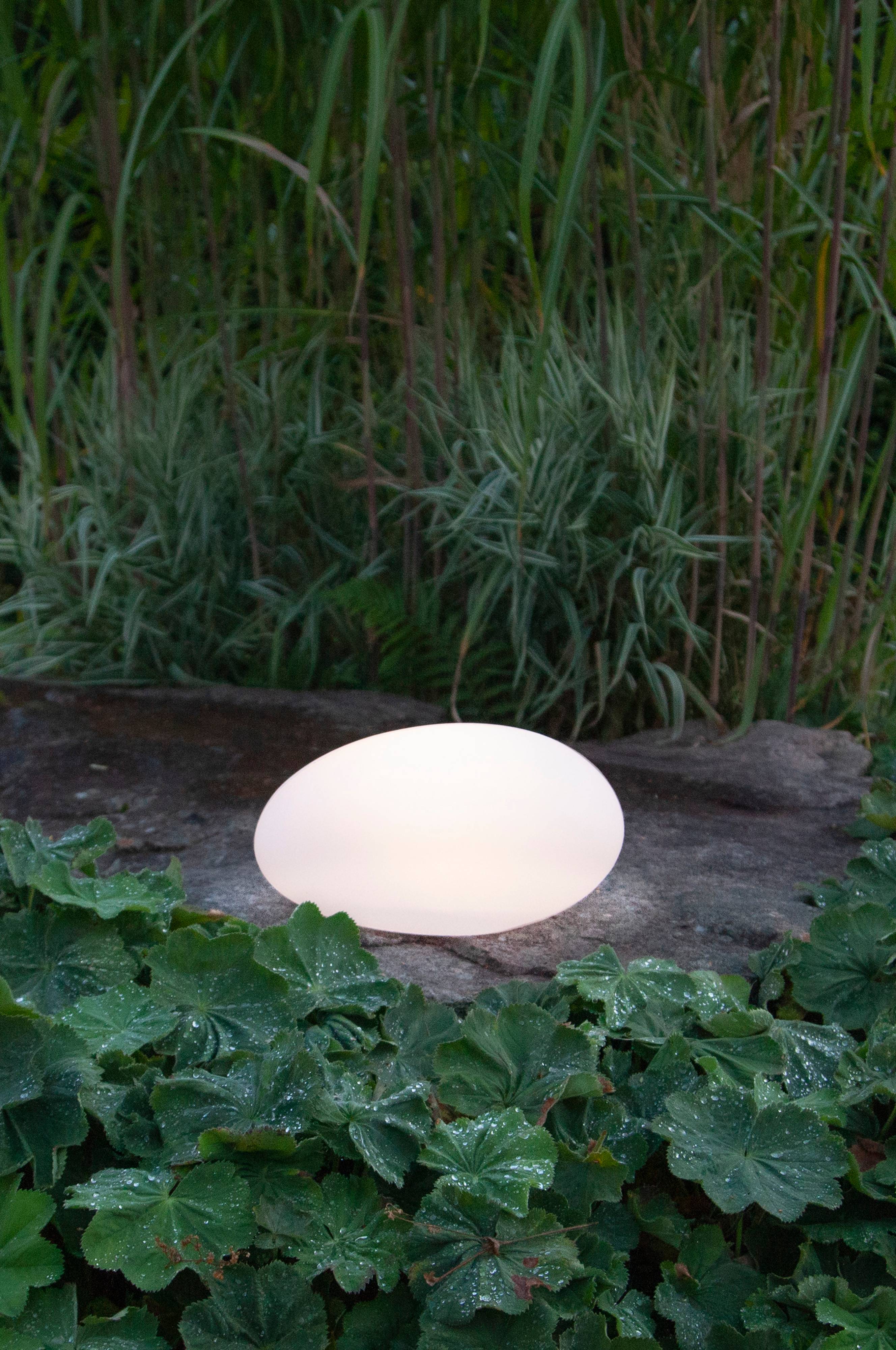 Solcelledekoration udformet som en hvid sten. Lyser op i mørket med varmt hvidt lys. Bredde 40 cm, højde 21 cm og dybde 31 cm. LED-lyskæde medfølger og batteri medfølger til lysrelæet. Gennemsnitlig levetid ca. 10.000 timer. Samlet effekt 0,13 W. Spænding 2,4 V DC.