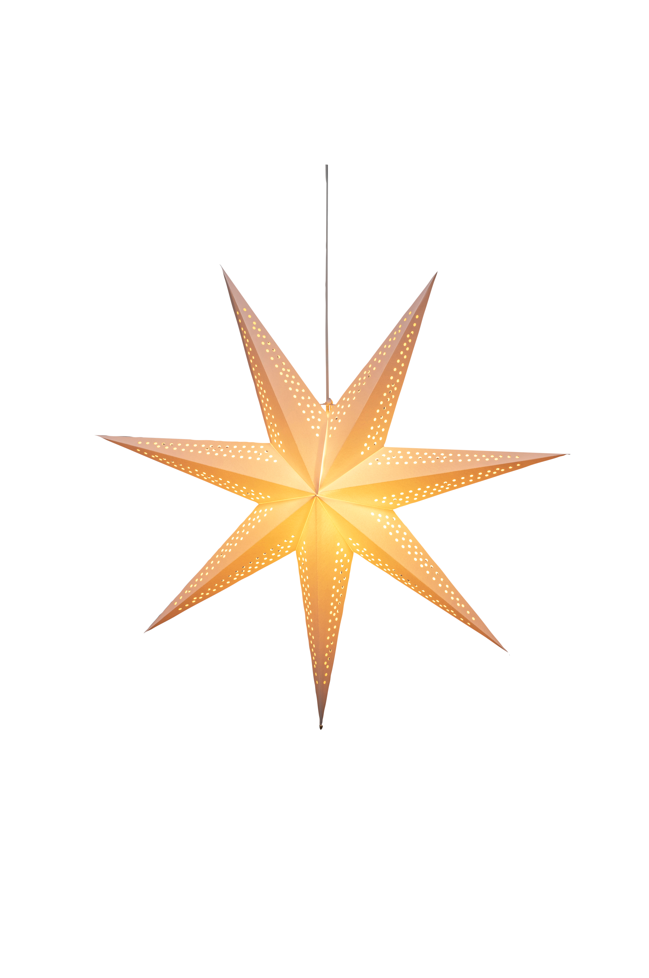 Festlig papirstjerne med syv spidser skaber en varm glød til advent og jul. Inkluderer ledningsstativ og tilslutningskabel. Perfekt til vinduer eller vægudstillinger, hvor den forbedrer juledekorationen med sin elegante silhuet og indbydende atmosfære.