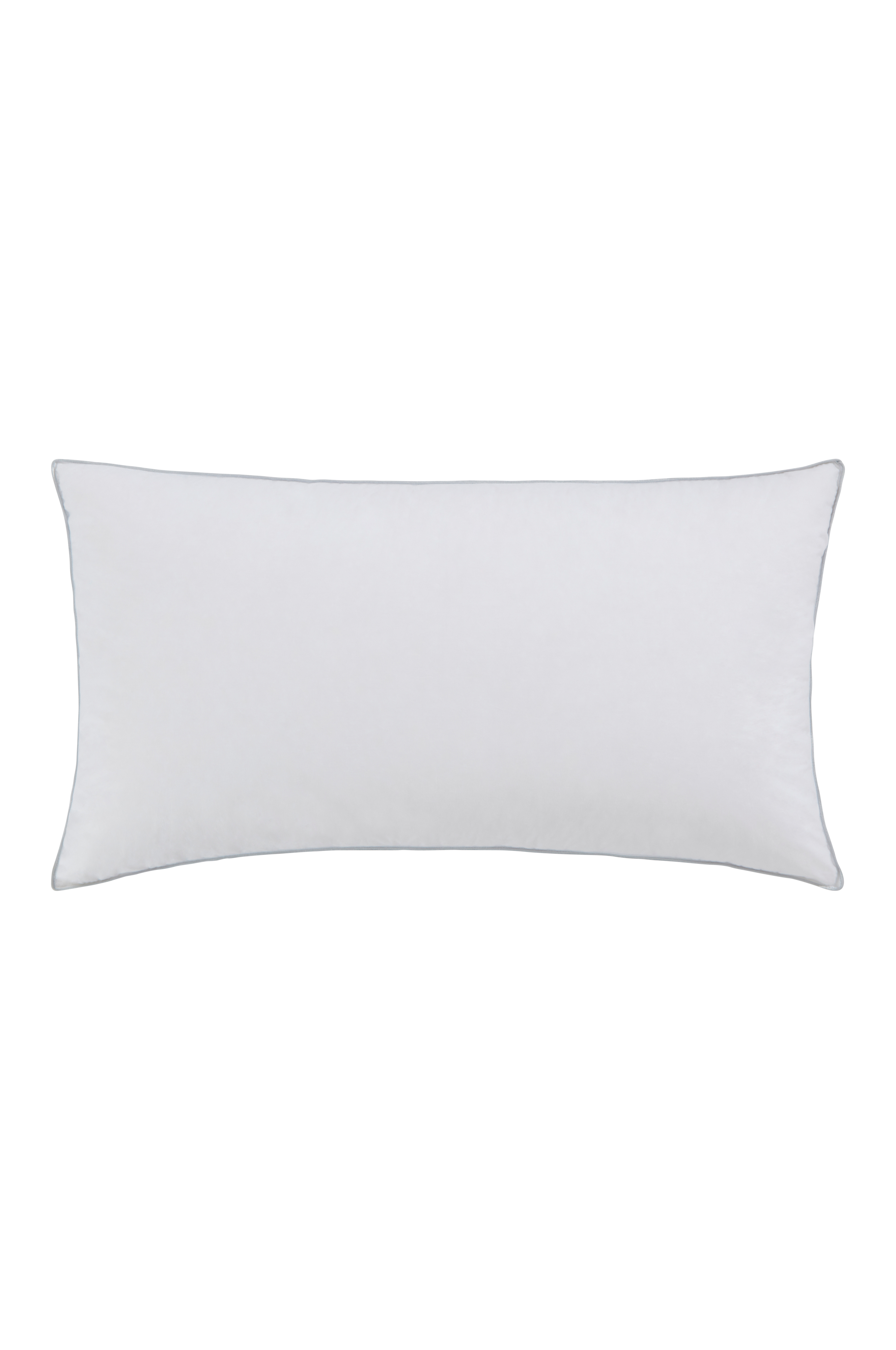 Det hvide yderstof er lavet af tæt bomuld, som ikke lækker dun, og har to sølvgrå pipingkanter hele vejen rundt. Dunpuden leveres i en bomuldstaske.