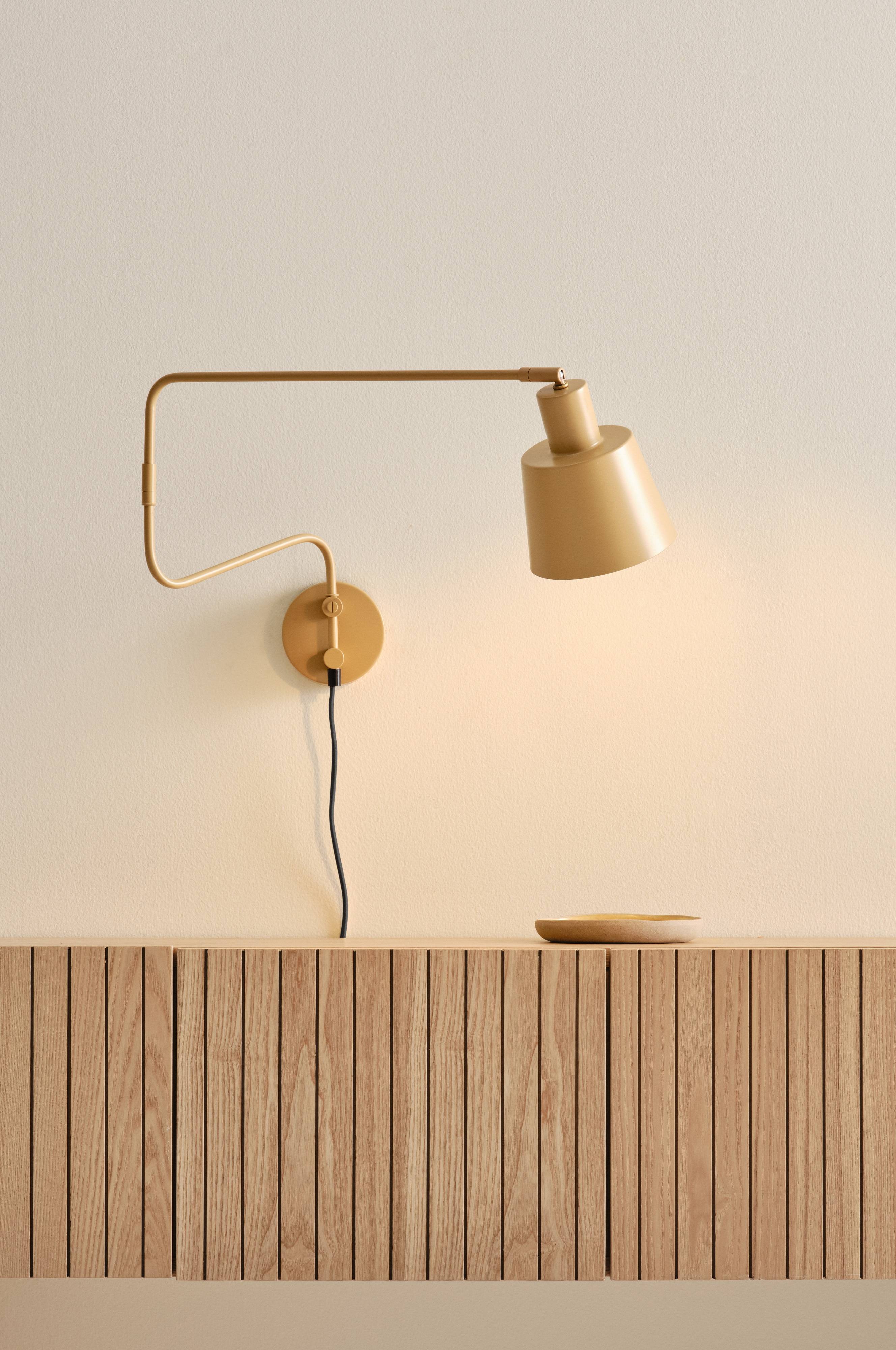 Væglampe i metal med en drejelig arm, der strækker sig ud fra væggen. Hvis du vil have plads i rummet, skal du vinkle lampen ind mod væggen. STIG er en meget fleksibel væglampe med mange anvendelsesmuligheder. Tekstilbeklædt ledning 1,5 m.