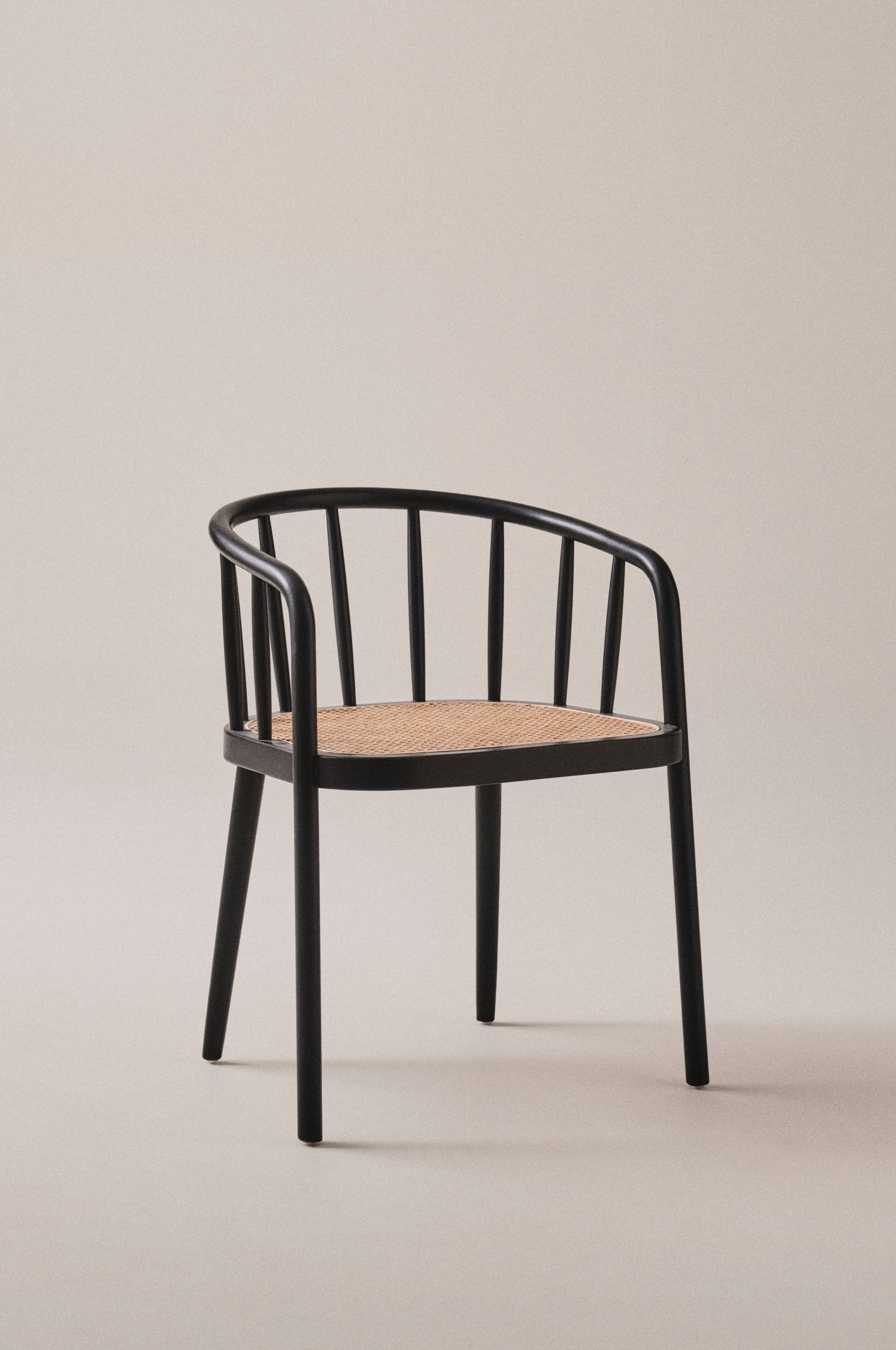 Stol med armlæn af hvidpigmenteret eg eller sort bøg. En behagelig stol med bløde linjer og formet ryg.