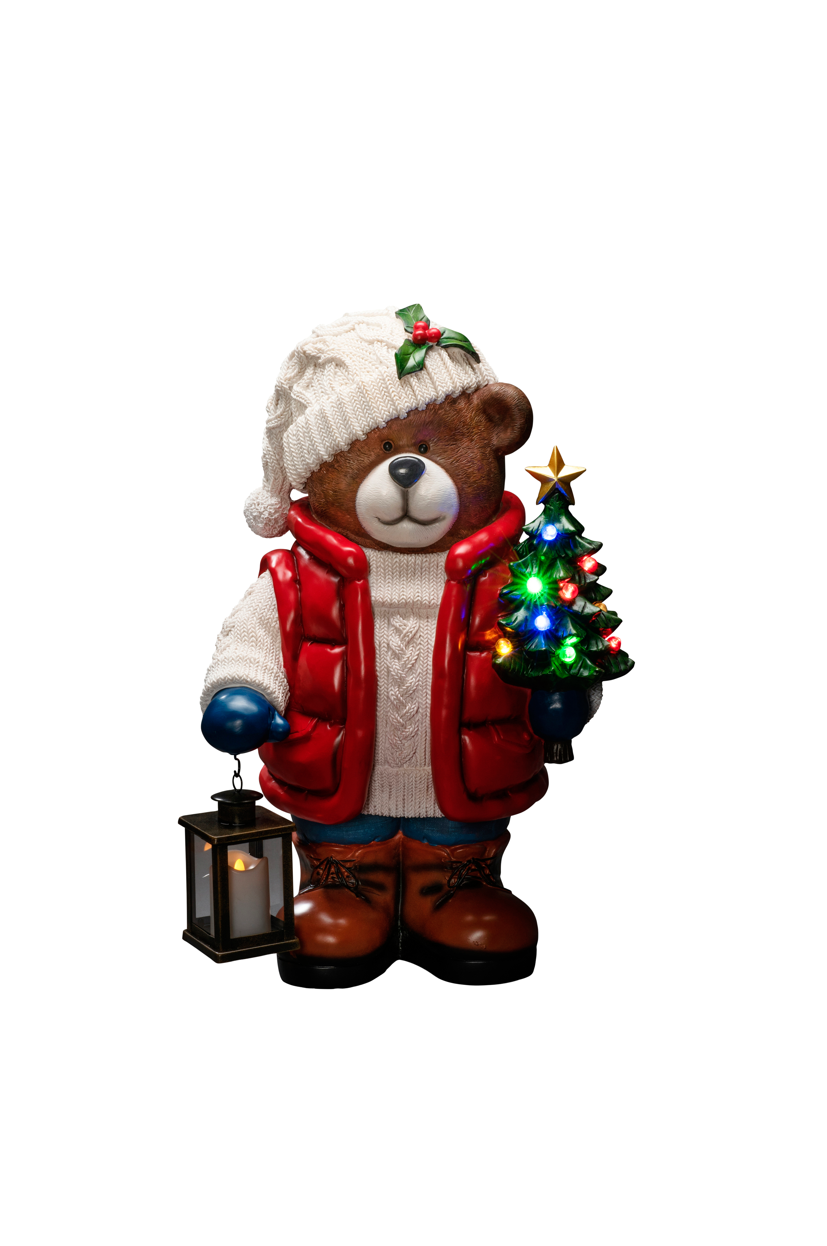 Stor bamse med 10 LED til udendørs brug. Bruger 5 AA-batterier (medfølger ikke). Julepynten har en timerfunktion på 6 timer. Højde 65,5 cm, bredde 42 cm, dybde 32 cm.