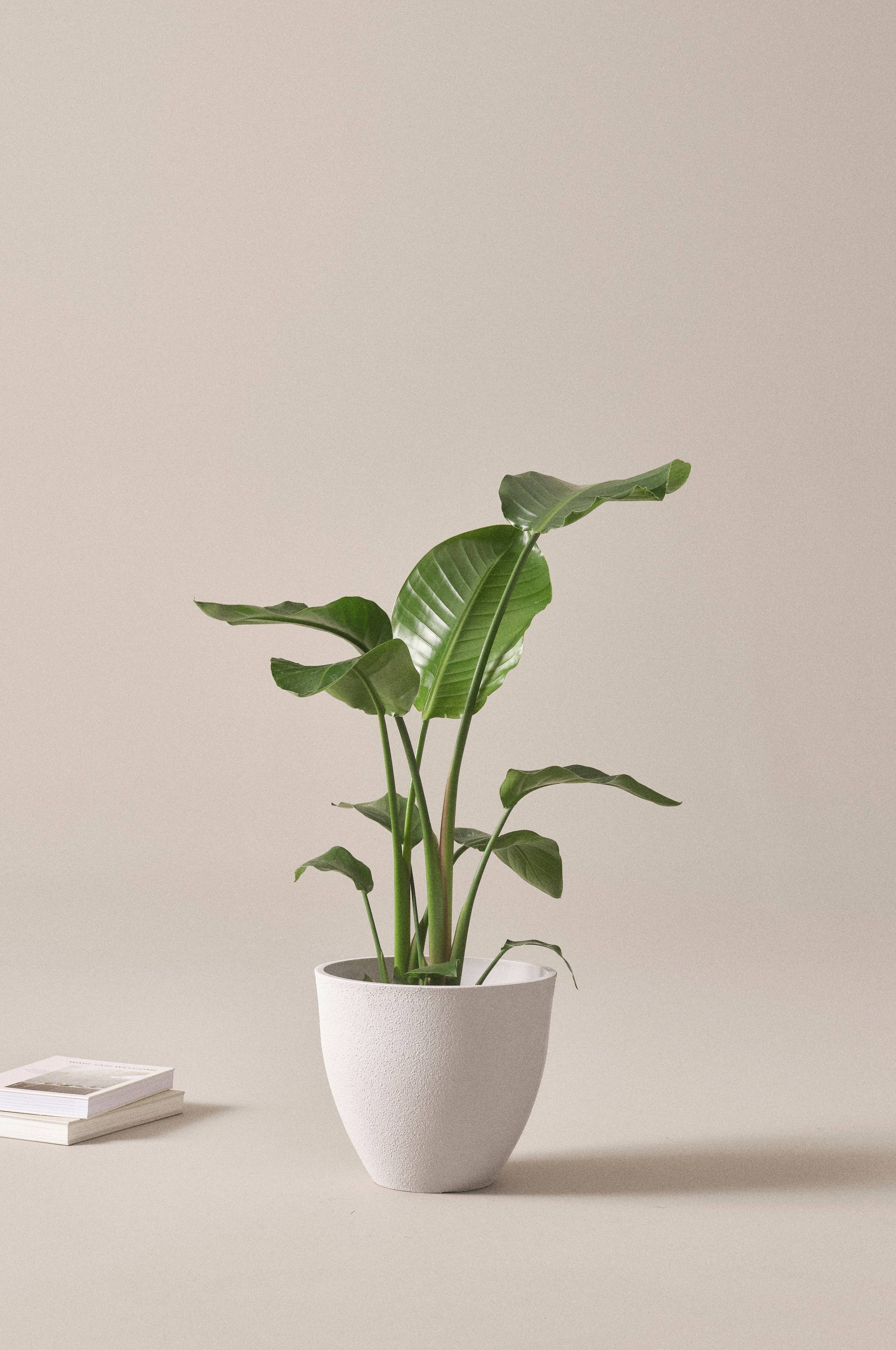 Strelitzia Nicolai er en smuk tropeplante med store grønne blade, en levende stueplante, der skaber en tropisk følelse i rummet. Det kræver meget lys og ikke alt for stor krukke hvis planten skal blomstre. Planten bør vandes i underskålen, ikke oppefra. Brug gerne en sprayflaske til at overbruse bladene med lidt vand. Trives i jævn temperatur over 16 °C. Strelitzia Nicolai er smuk alene og i gruppe med flere grønne planter, skab gerne kontrast med variation i bladenes farve og form.