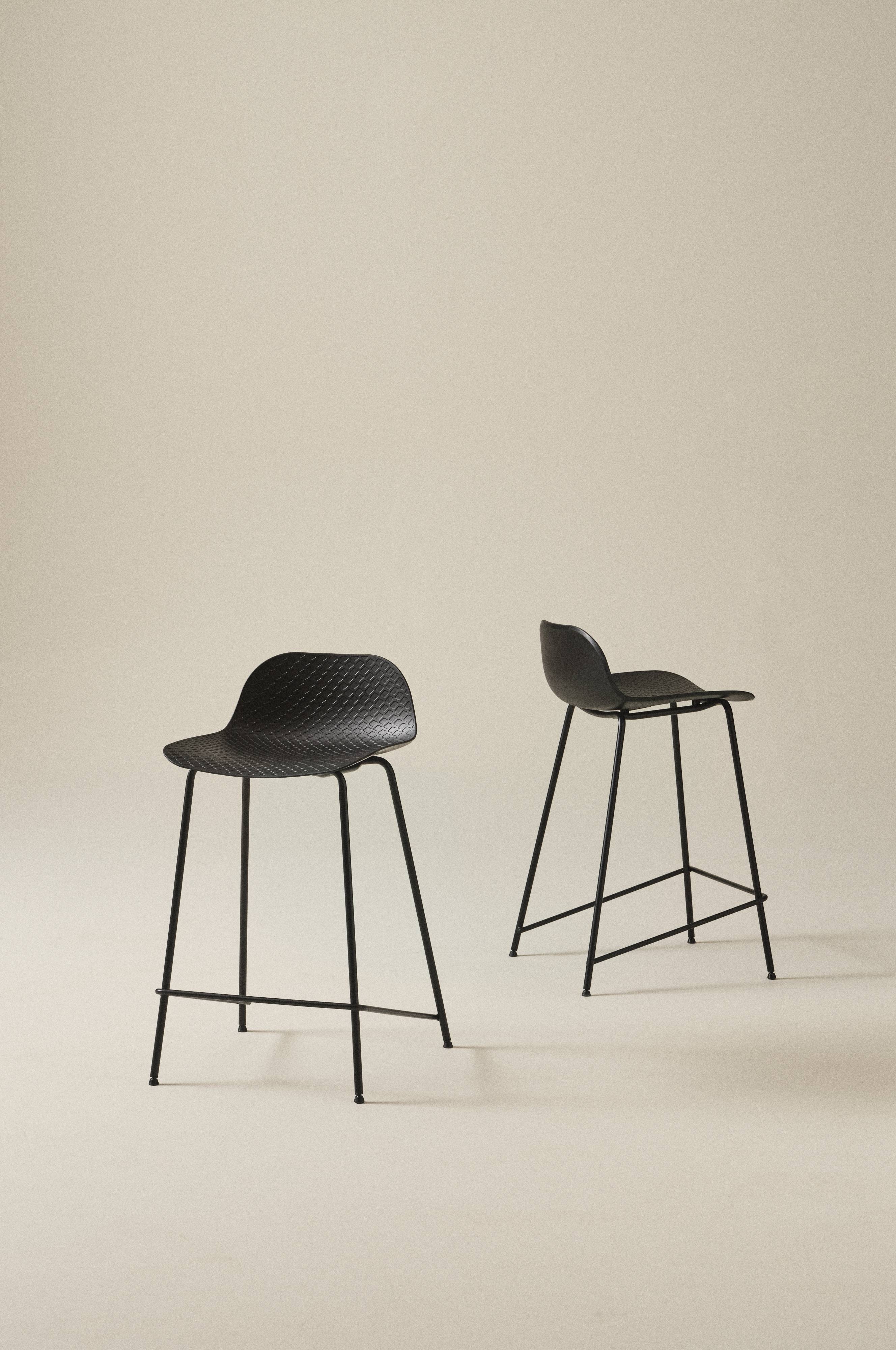 2-pak barstole med sæde af plast og ben af stål. Sædet som er behageligt med lavt ryglæn, har flot strukturmønster og pulverlakeret overflade. Benene er noget A-formede hvilket gør stolen stabil, og på tre sider er der behagelige fodstøtter. TARIFA passer perfekt ved køkkenøen, og du får et godt spisested til f.eks. morgenmad, inden dagen går i gang. Skal færdigsamles. Samlevejledning medfølger.