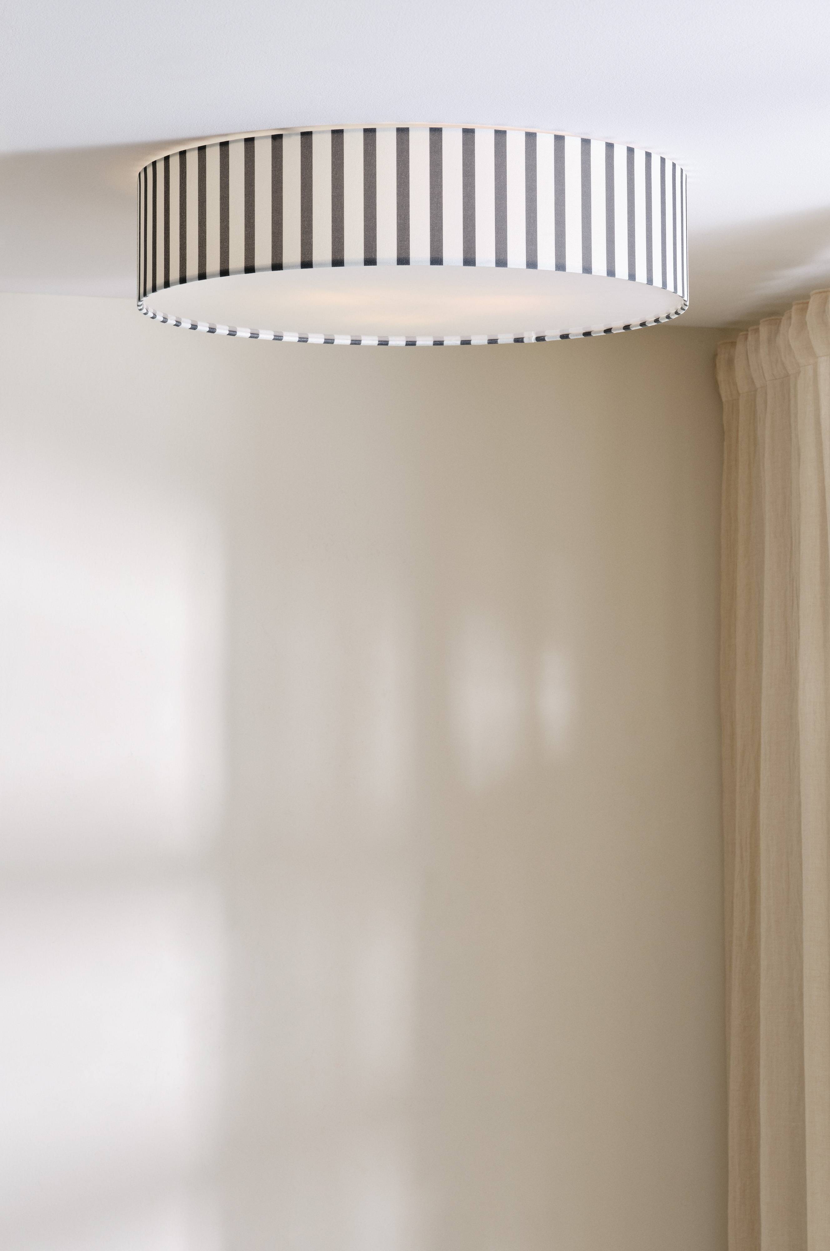 TOLLO plafond, en loftslampe med et friskt look, har en stribet stofskærm, der kaster et varmt, indbydende skær. Akrylbunden sikrer en jævn lysfordeling. Perfekt til en moderne makeover af indretningen.