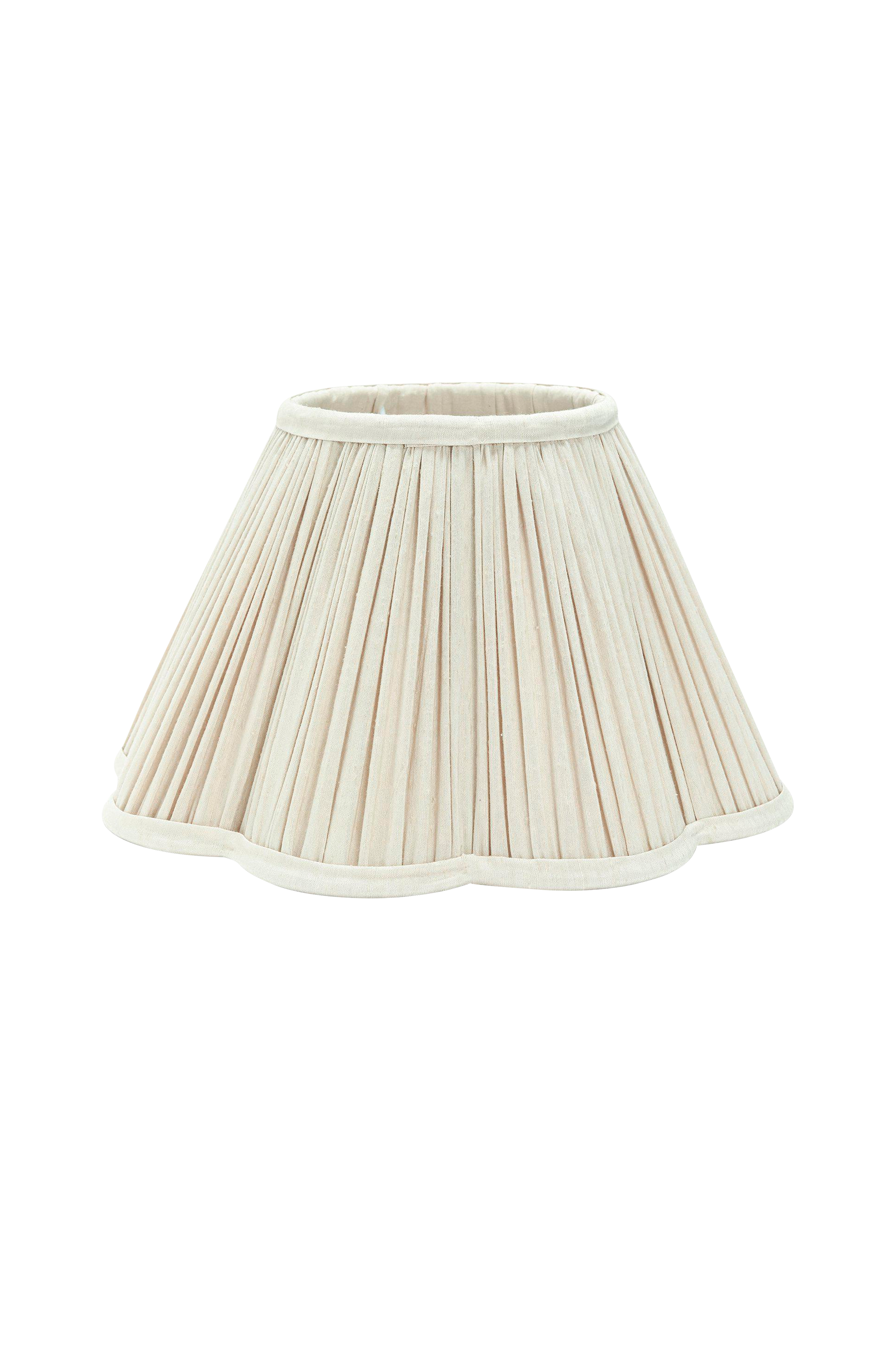 Siv lampeskærm med rynket stof i silkelook og foret med bomuldsstof i samme farve. Skærmen har en bølget form forneden som skaber et flot lysflow. Lampeskærmen har en topbærering og kan bruge til gulvlampe med bøjelig arm, væglampe og bordlampe med bøjelig arm. Skærmen kan også kombineres med et loftophæng med E27-fatning og på den måde bruge den som pendel og loftlampe. E27-topbærering. Højde 20 cm, bredde forneden 35 cm, bredde foroven 16 cm.