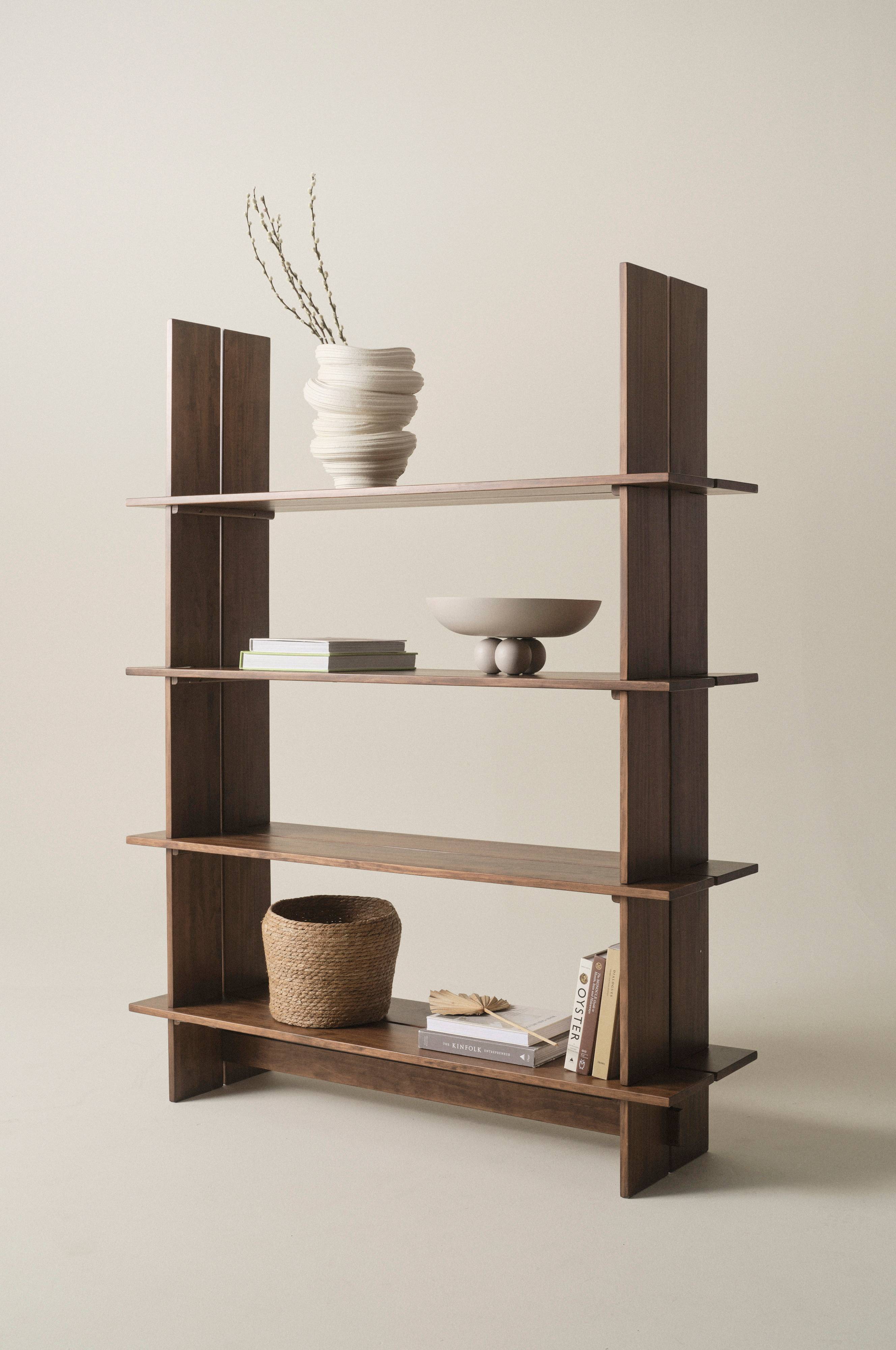 Størrelse: Højde 180 cm, bredde 140 cm, dybde 40 cm. Højde mellem hylderne 37 cm. Frihøjde under møbel 20 cm. Højde fra øverste hylde til toppen 41 cm. Tykkelse fyrretræ 2 cm.