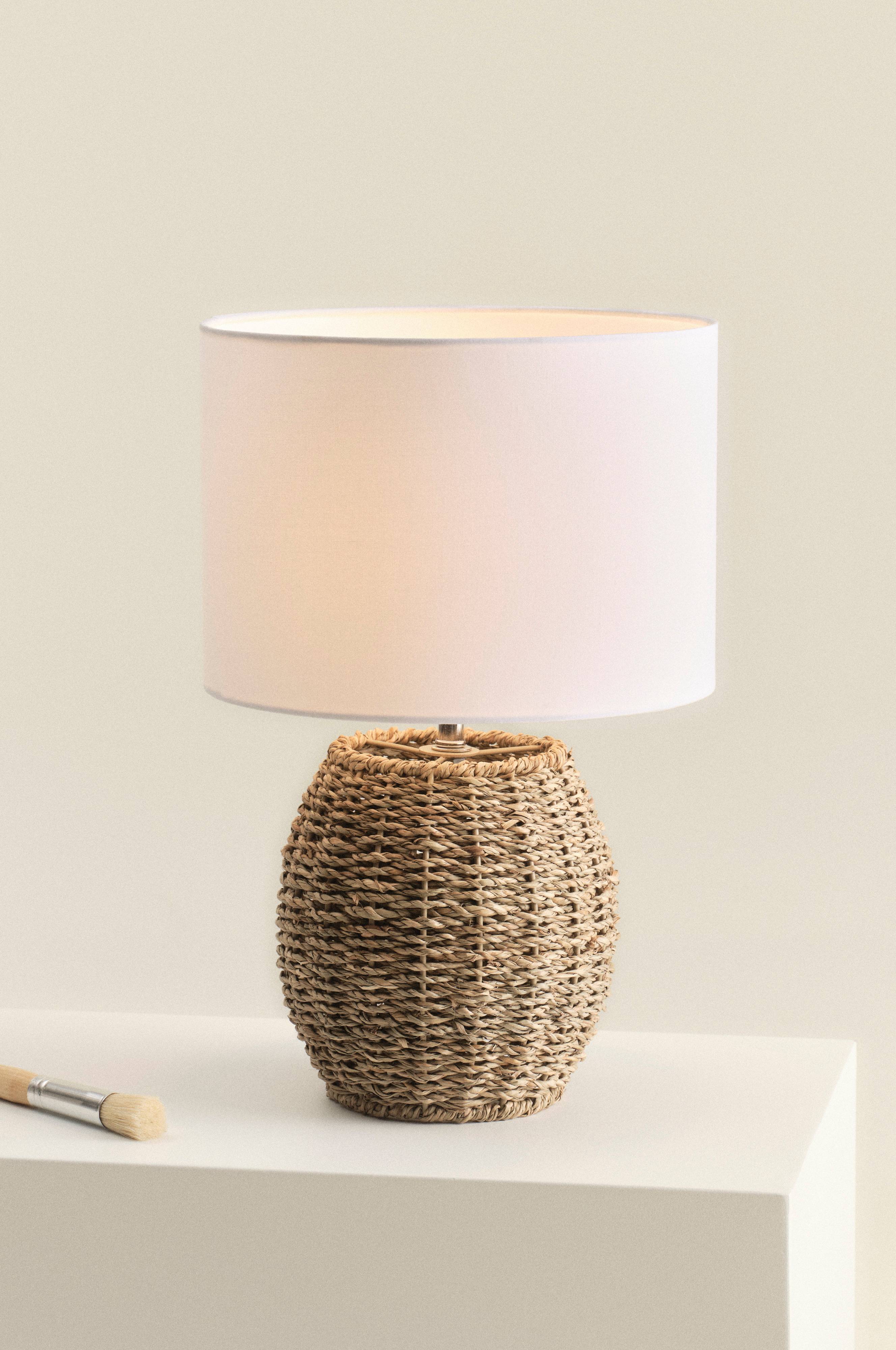 Bordlampe med rustik fod af naturligt søgræs som er flettet rundt om et metalstel. Foden er afrundet og spændende kontrast opstår sammen med den stilrene, lige skærm. Skærmen er af bomuld med stel af metal. Sort ledning med strømafbryder. Lampen er ujordet, klasse 2.