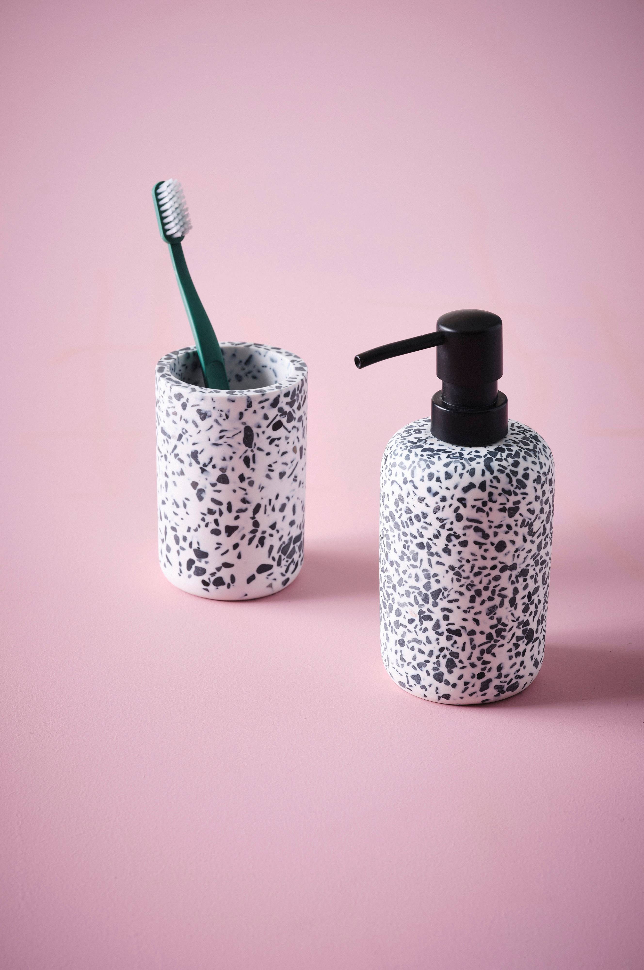 Badeværelsessæt med to dele i polyresin. Sættet indeholder et tandkrus og en dispenser med pumpe. Fyld dispenseren med din yndlingssæbe. Det er bedre for miljøet at købe refill, da mængden af plast reduceres. Den er også egnet til body lotion eller shampoo.
