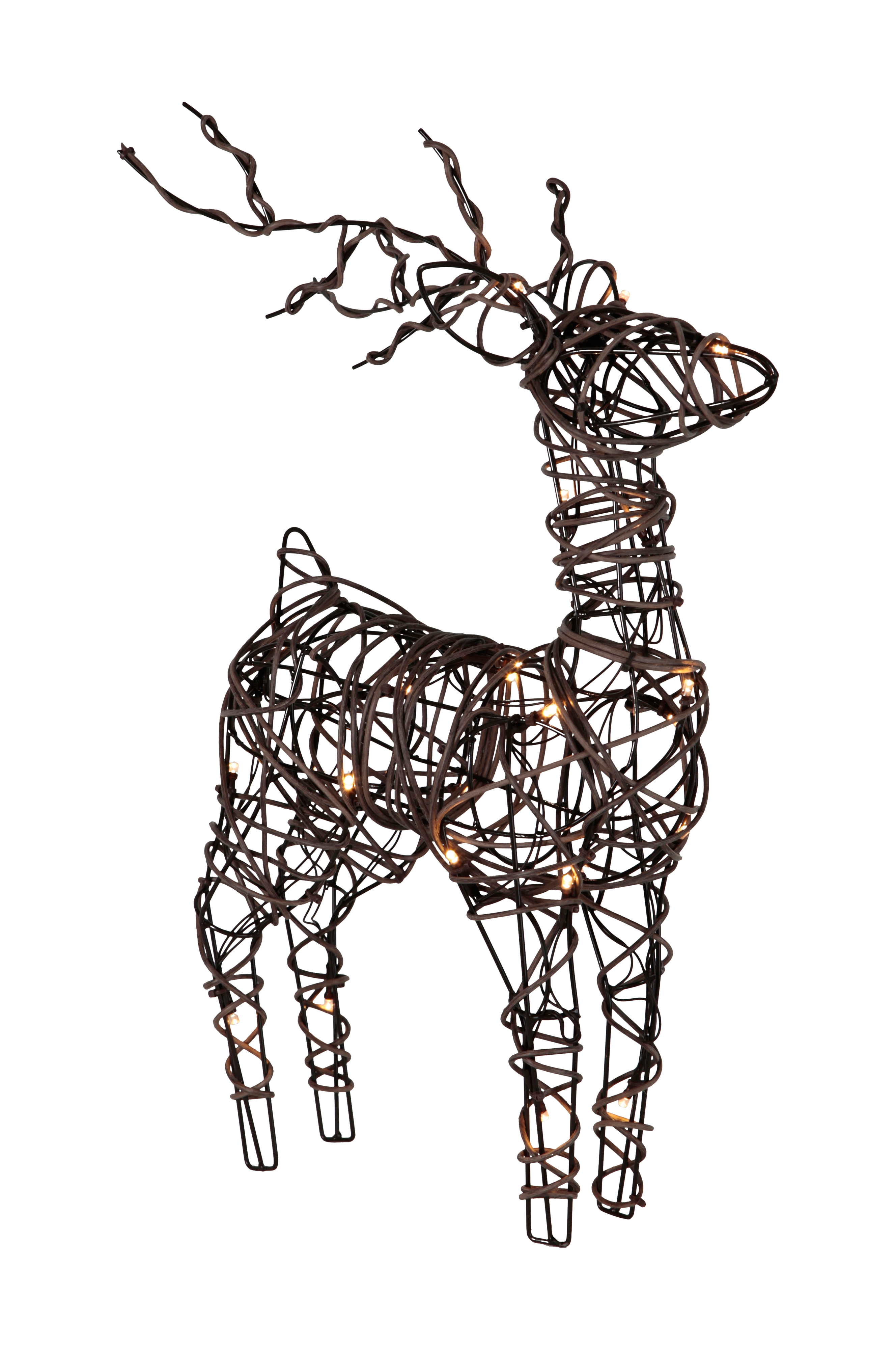 Rensdyr med batteri. I metal og plast med 26 LED-pærer. Timer 6/18 timer. Højde 55 cm. Dybde 12 cm. Bredde 36 cm. AA-batteri. Batteri medfølger ikke.