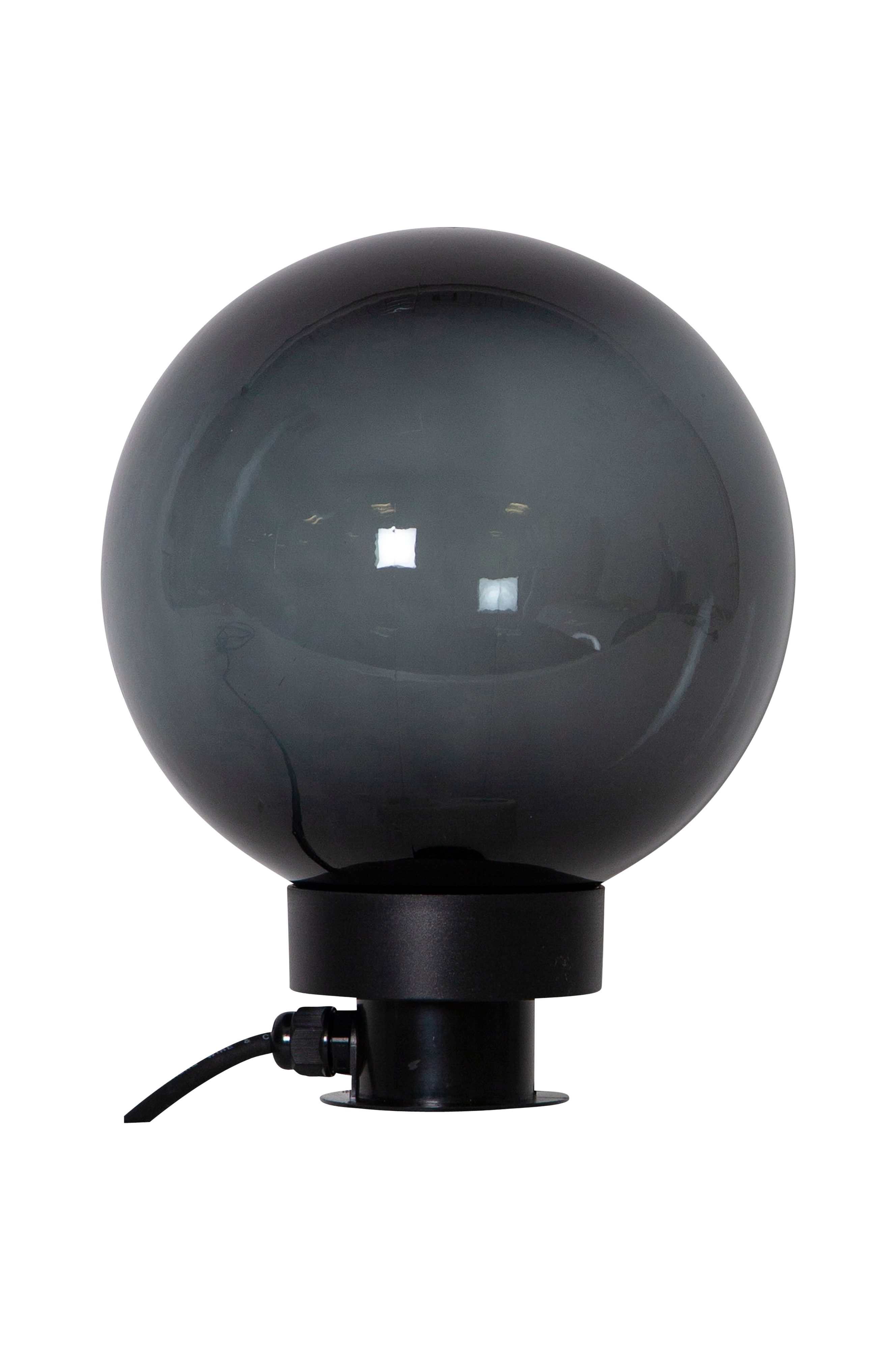 Stilren belysning til din have i form af en røgfarvet globe, 20 cm i diameter og højde 24 cm. 230 V og til lyskilder med E27 sokkel og Maks. 40W (medfølger ikke). Varier lysskæret med forskellige lyskilder. Tilslutningskabel længde 500 cm.