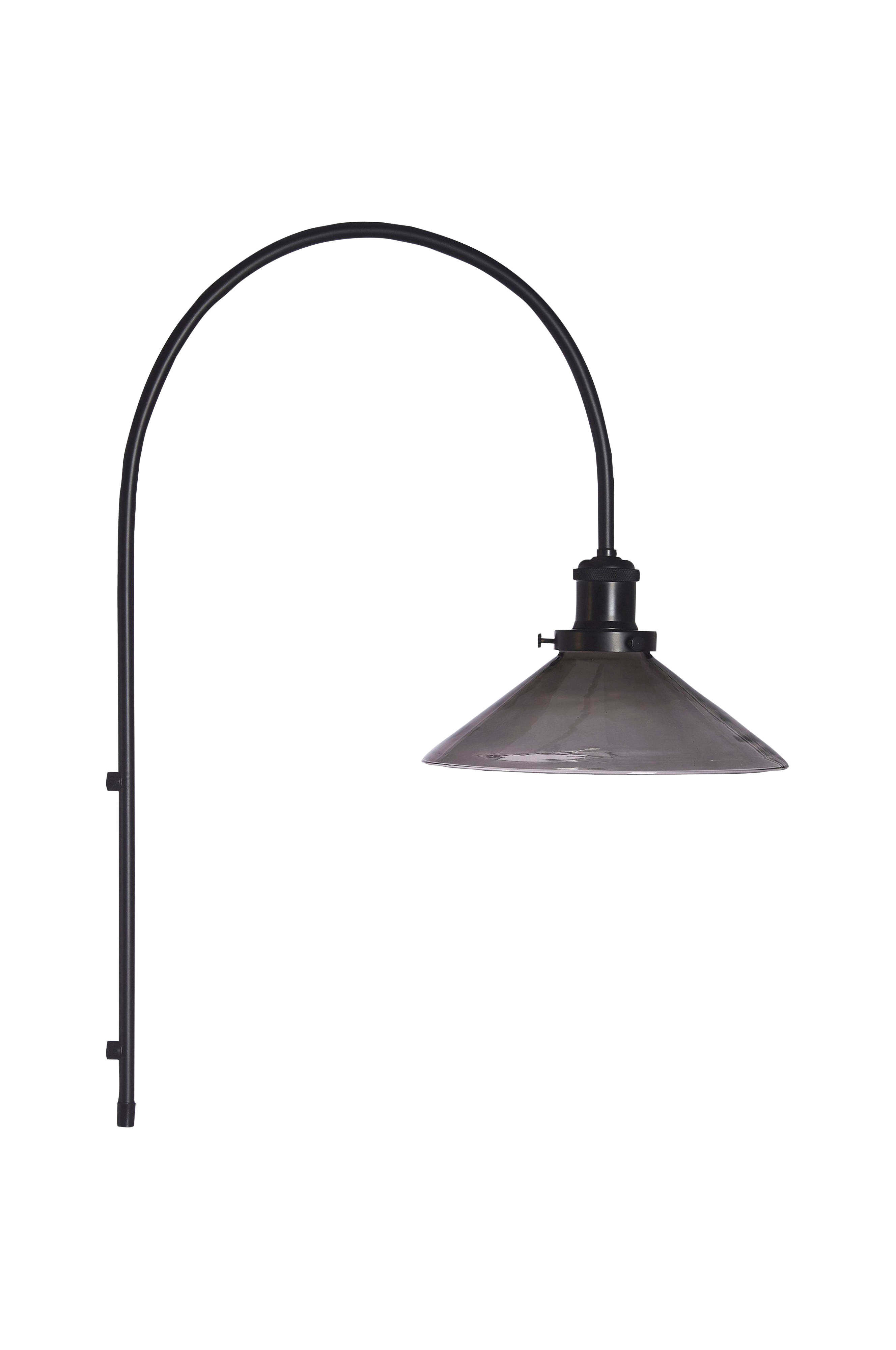 August væglampe med metalbue og skærm i glas. Glasskærmen sidder i en fatning i børstet metal. Lampen monteres nemt på væggen med et stilrent beslag som skrues fast. Ledningen er 2 meter lang med stil til vægudtag og strømafbryder, som sidder 55 cm fra nederste del af metalbuen. Fatningen sidder 20 cm fra buens top. Skærmen er 25 cm i diameter og højde 9,5 cm. Pære købes separat.