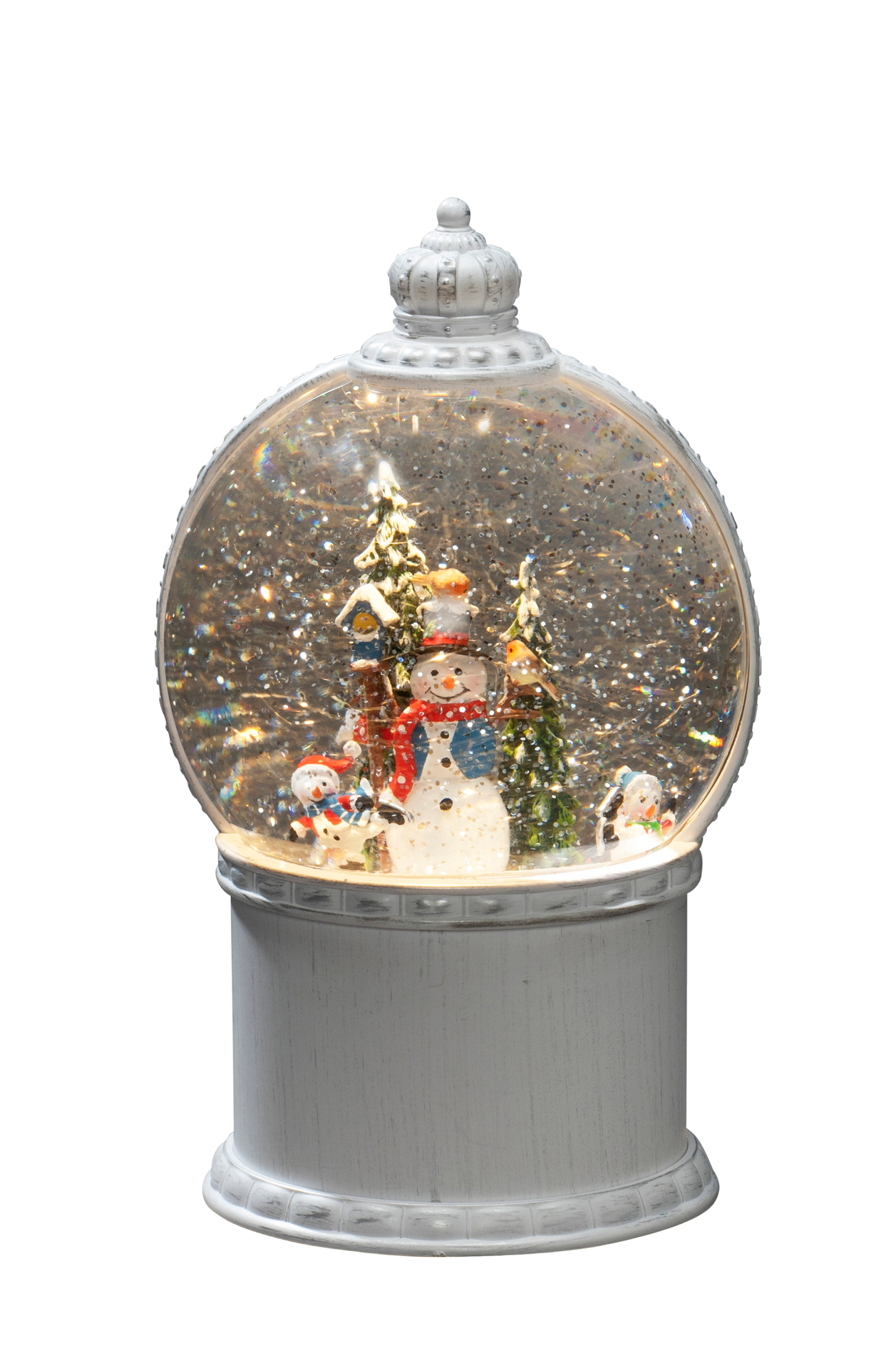 Vandfyldt juledekoration med snemænd og juletræer. Kontinuerligt virvlende glitter og roterende funktion. Varmhvid LED. Drives enten med 3 stk. AA-batterier (medfølger ikke) eller USB. Lygten har en timerfunktion på 5 timer. 1,8 meter USB-kabel medfølger. Højde 21 cm, bredde 12,5 cm, dybde 12,5 cm.