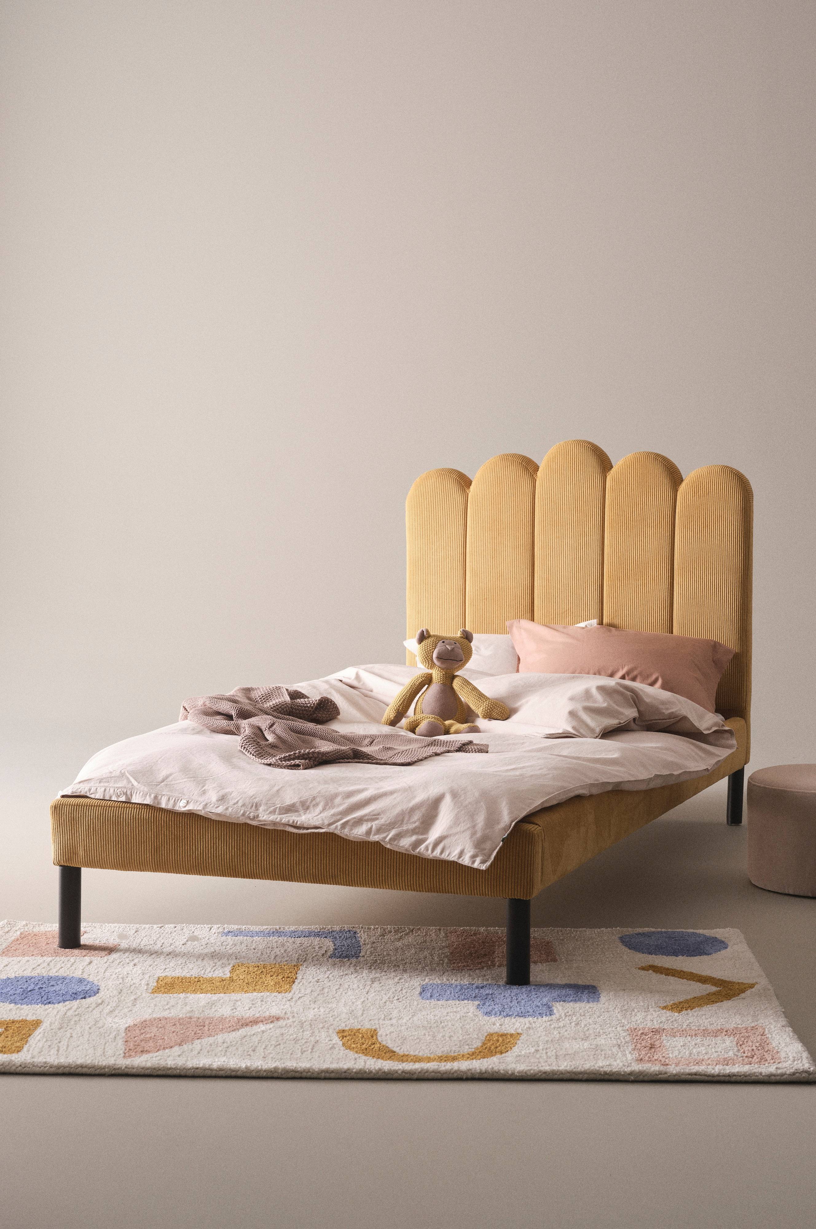 Børneseng med høj, beklædt hovedgavl. Rammen er af FSC-certificeret fyrretræ og lamelbunden af FSC-certificeret plywood med polyamidbånd. De runde, lige ben er af malet birk. Hovedgavlen og rammen rundt om er betrukket med vatteret fløjlsstof af polyester. Gavlen er flot stribequiltet. VARESE er både elegant og hyggelig. Det er skønt at sidde og læne sig mod den behagelige sengegavl og lytte til en historie. Madrasmål 90x200 cm. Madras medfølger ikke.