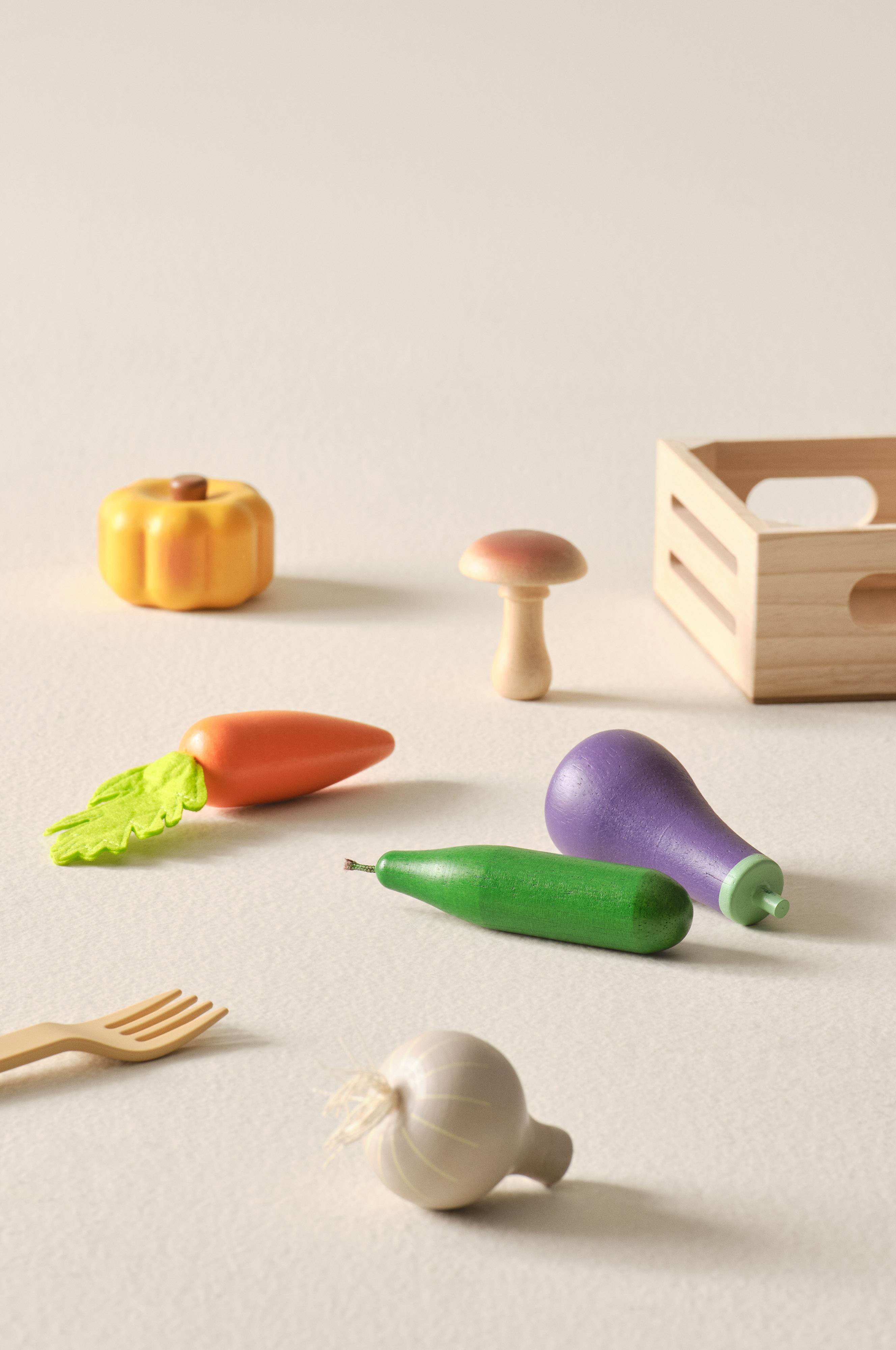 VEGETABLE legetøjsmad sætter gang i fantasien på børneværelset, perfekt til børn i alderen 2-8 år. Den nyttige kasse er fremstillet af MDF og fungerer både som opbevaring og legesæt. Indeholder farverige grøntsager i gummitræ: græskar, aubergine, champignon, agurk, hvidløg og gulerod. En herlig tilføjelse til legetiden.