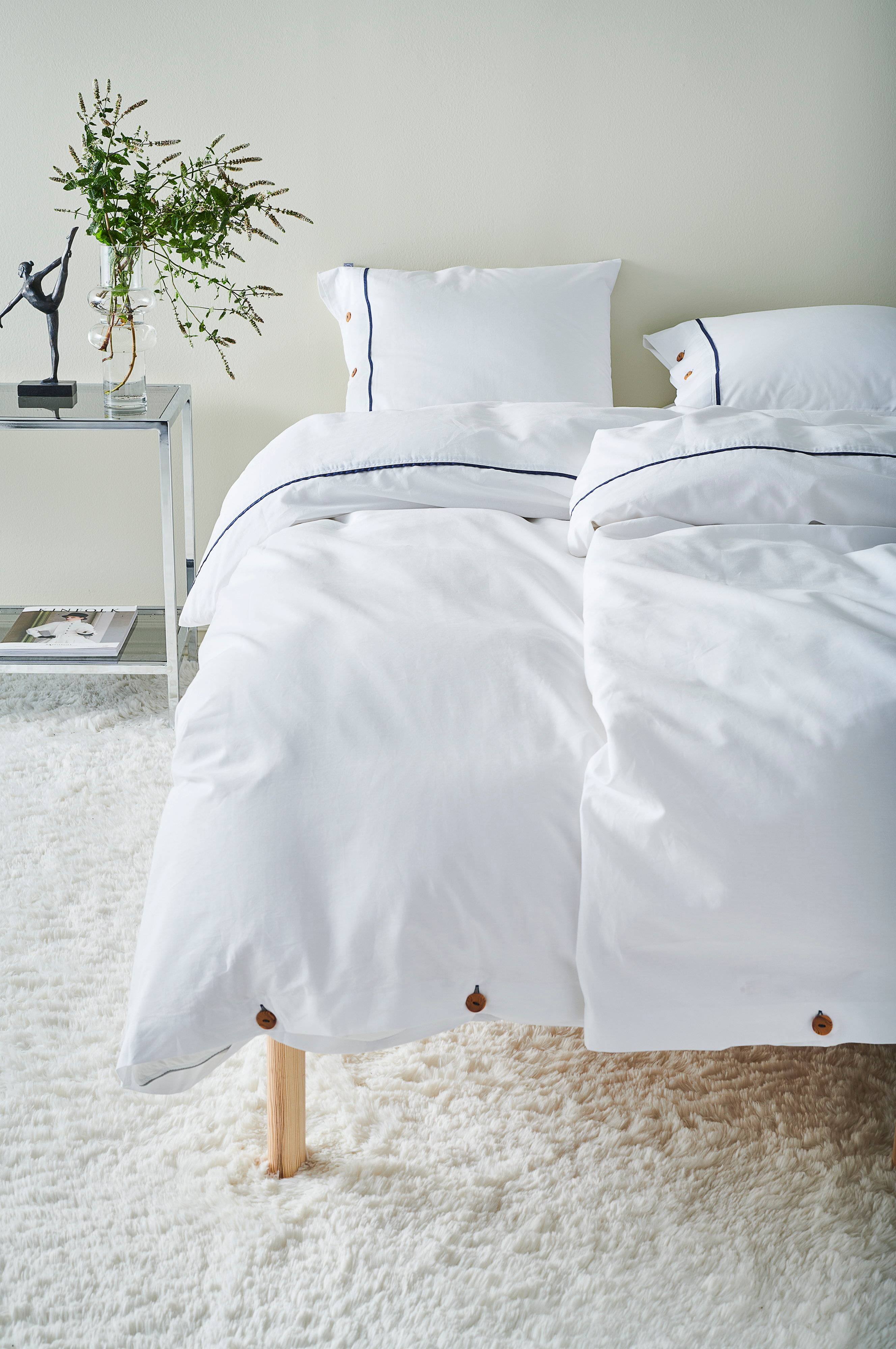 Dynebetræk af bomuld. Sengetøj af bomuld er luftigt og blødt mod kroppen. Paspolering foroven og plastknapper til lukning. Trådtæthed på 144 tc. (Trådtætheden angiver antal tråde, Thread Count, pr. kvadrattomme i et stof. Jo højere trådtæthed, jo højere kvalitet).