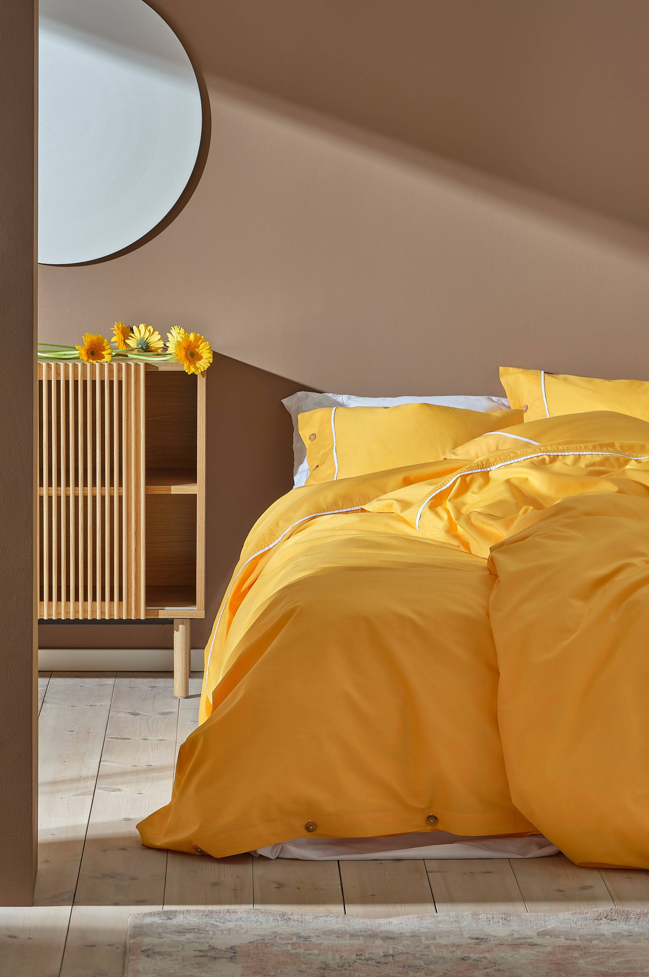 Dynebetræk af bomuld. Sengetøj af bomuld er luftigt og blødt mod kroppen. Paspolering foroven og plastknapper til lukning. Trådtæthed på 144 tc. (Trådtætheden angiver antal tråde, Thread Count, pr. kvadrattomme i et stof. Jo højere trådtæthed, jo højere kvalitet).