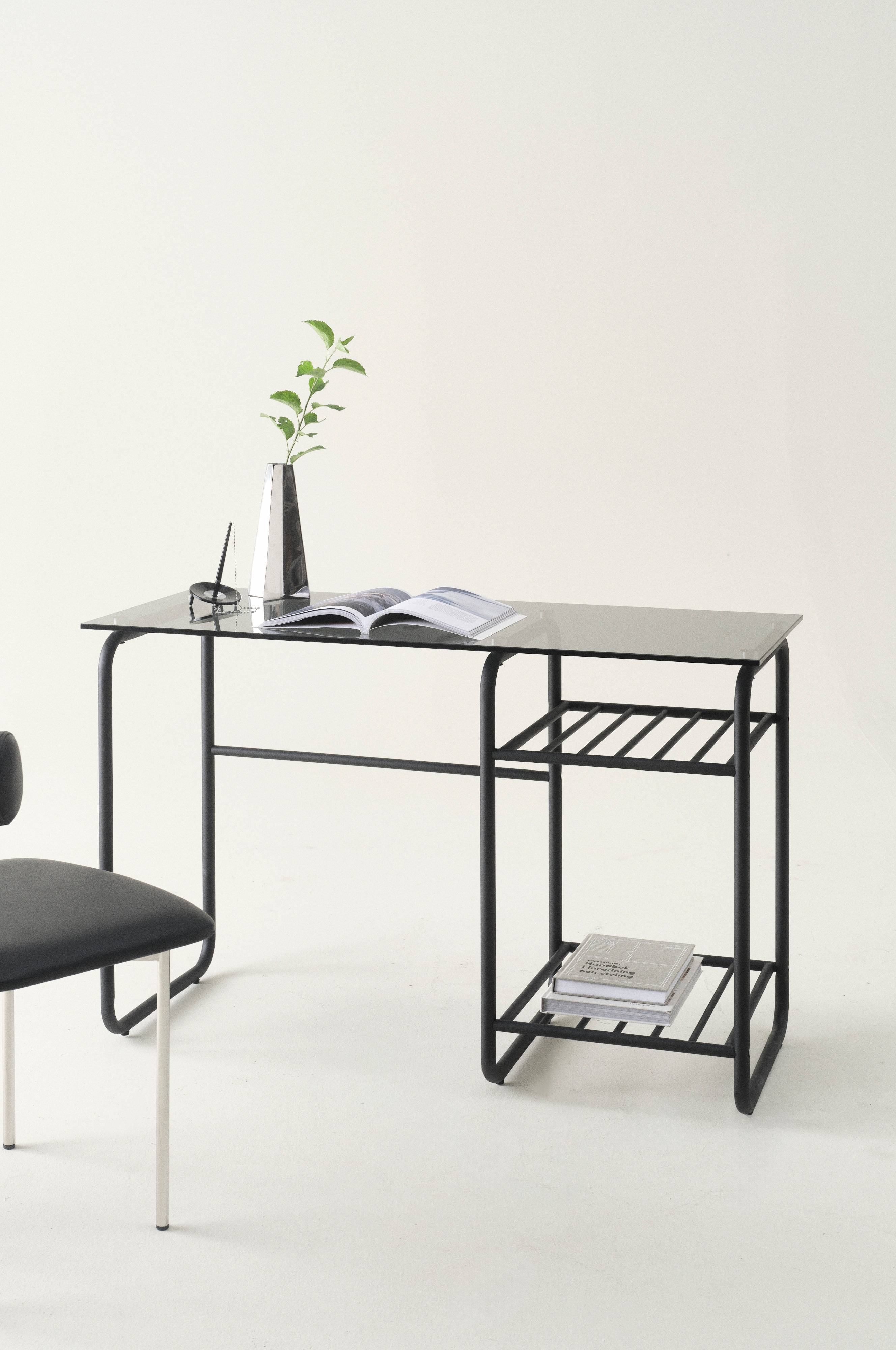 Skrivebord med bordplade af hærdet glas og metalstel af forkromede stålrør. Stellet har afrundede hjørner og skrivebordet emmer af 70'erne. Skal færdigsamles. Samlevejledning medfølger.