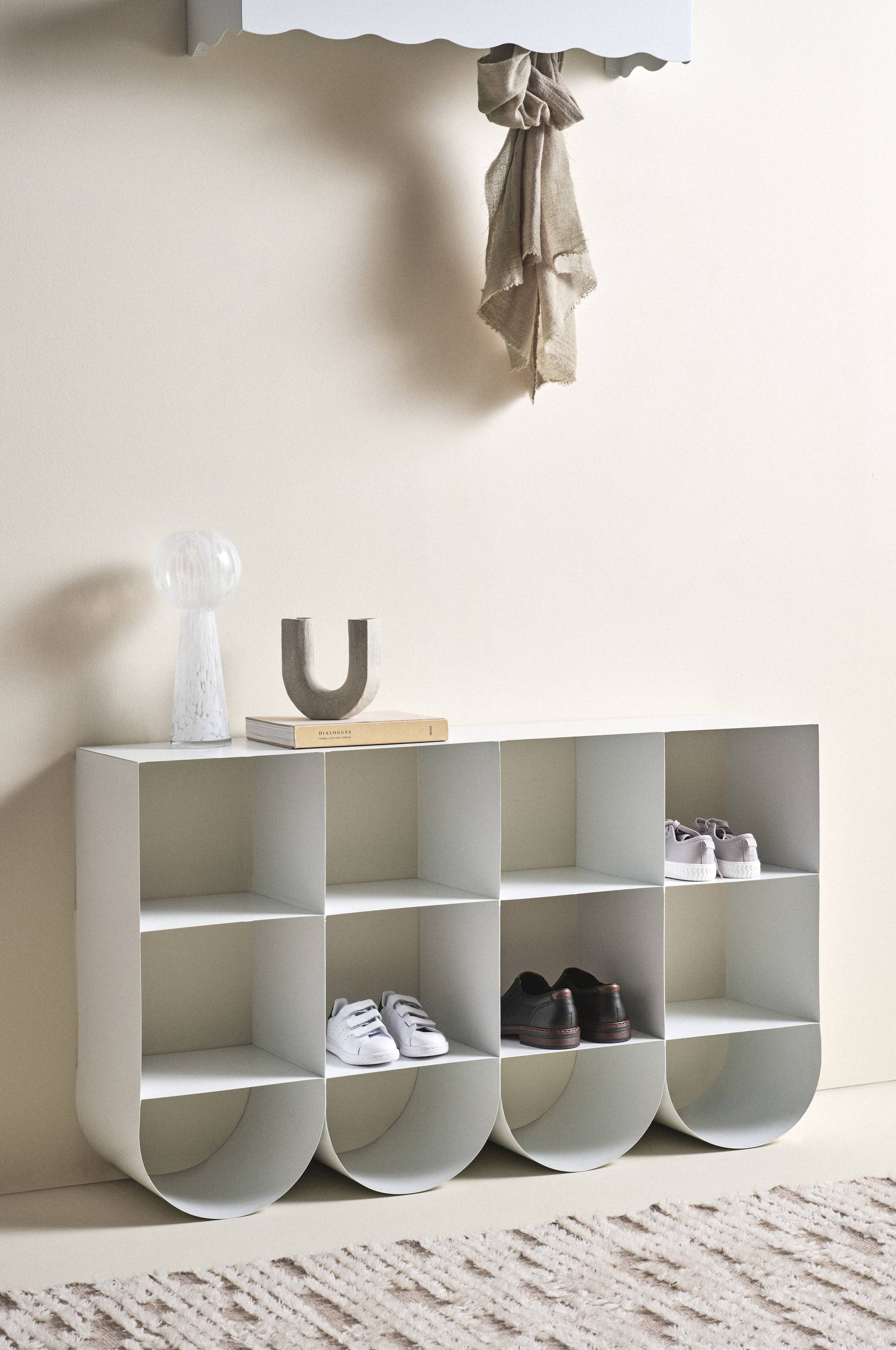Skoreol af stål. Reolen har en charmerende form med buer nedad og otte rum til sko. Den kan naturligvis også stå i børneværelset med yndlingslegetøjet i. Vægbeslag bagpå så reolen kan fastgøres på væggen. Hylden er malet med oliebaseret farve.