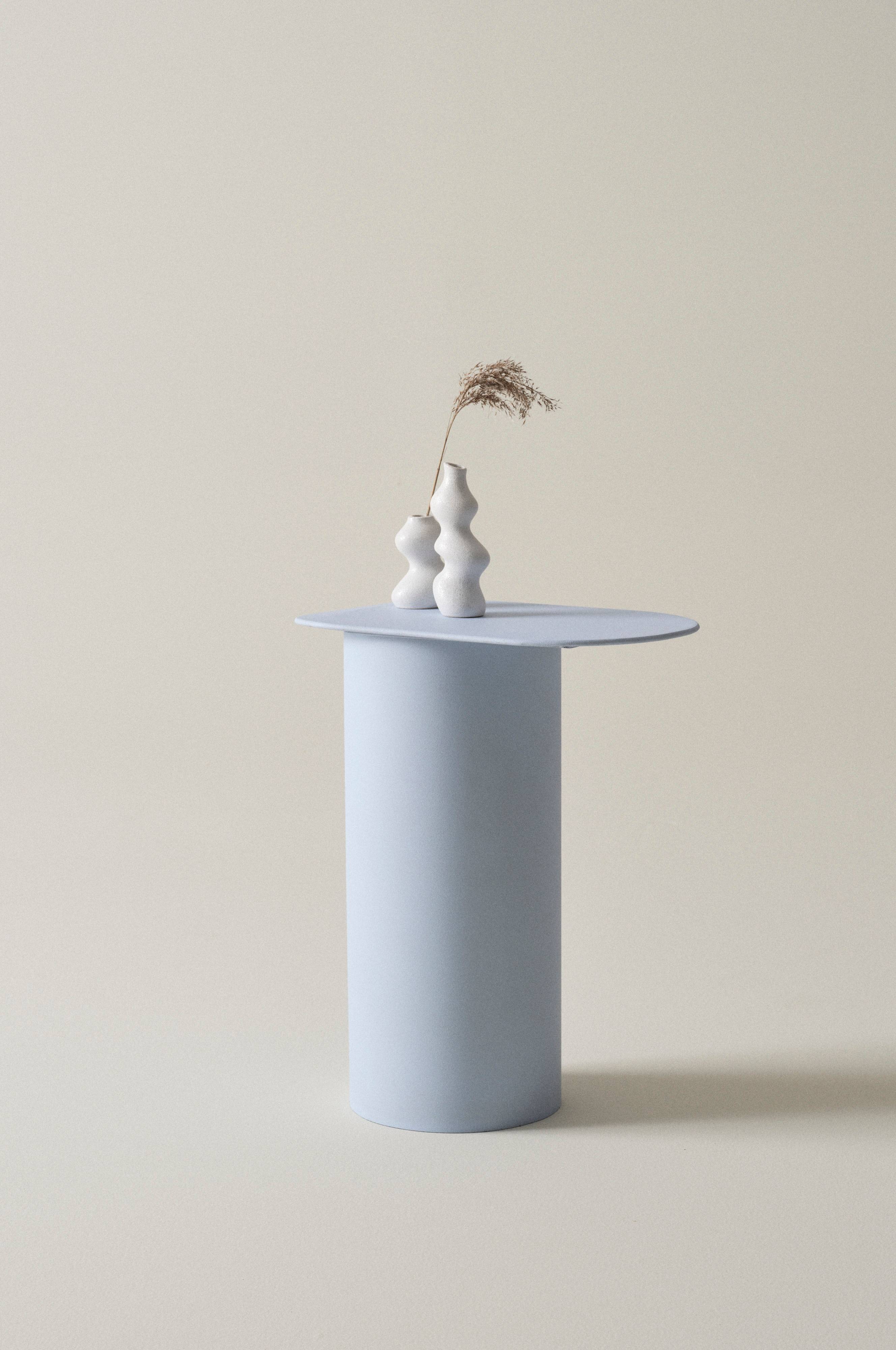 Sidebord af jern, med en asymmetrisk bordplade placeret asymmetrisk på den runde bund. Sidebordet er ensfarvet og overfladen er blevet pulverlakeret med en mat finish. Nogle gange kan det der overrasker være det bedste.