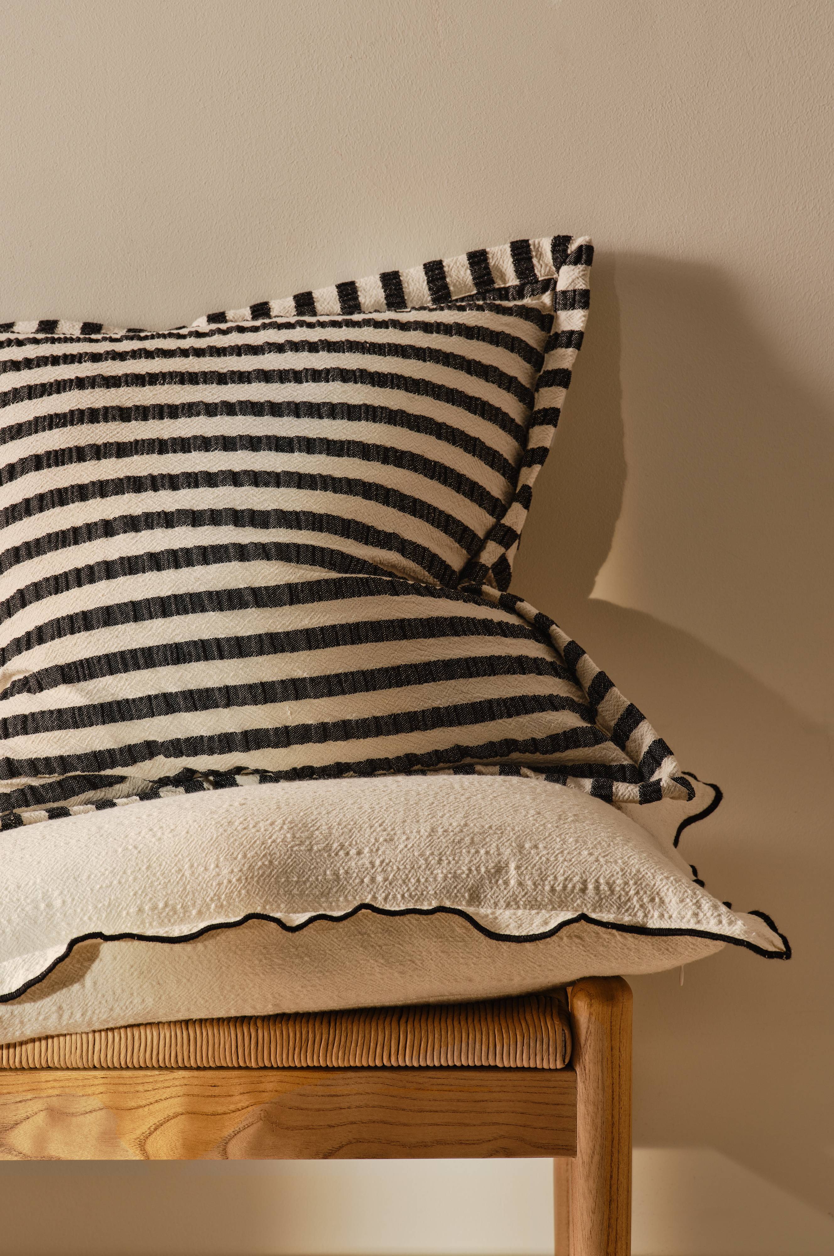 WENDY pudebetræk bringer unik flair til ethvert interiør. Dette sæt med to puder har en pude med elegante striber og en vingedetalje, mens den anden har en bølget kant med en kontrasterende finish. Disse pudebetræk er perfekte til at give dybde og karakter til din bolig og har et charmerende design, der passer til moderne indretning.