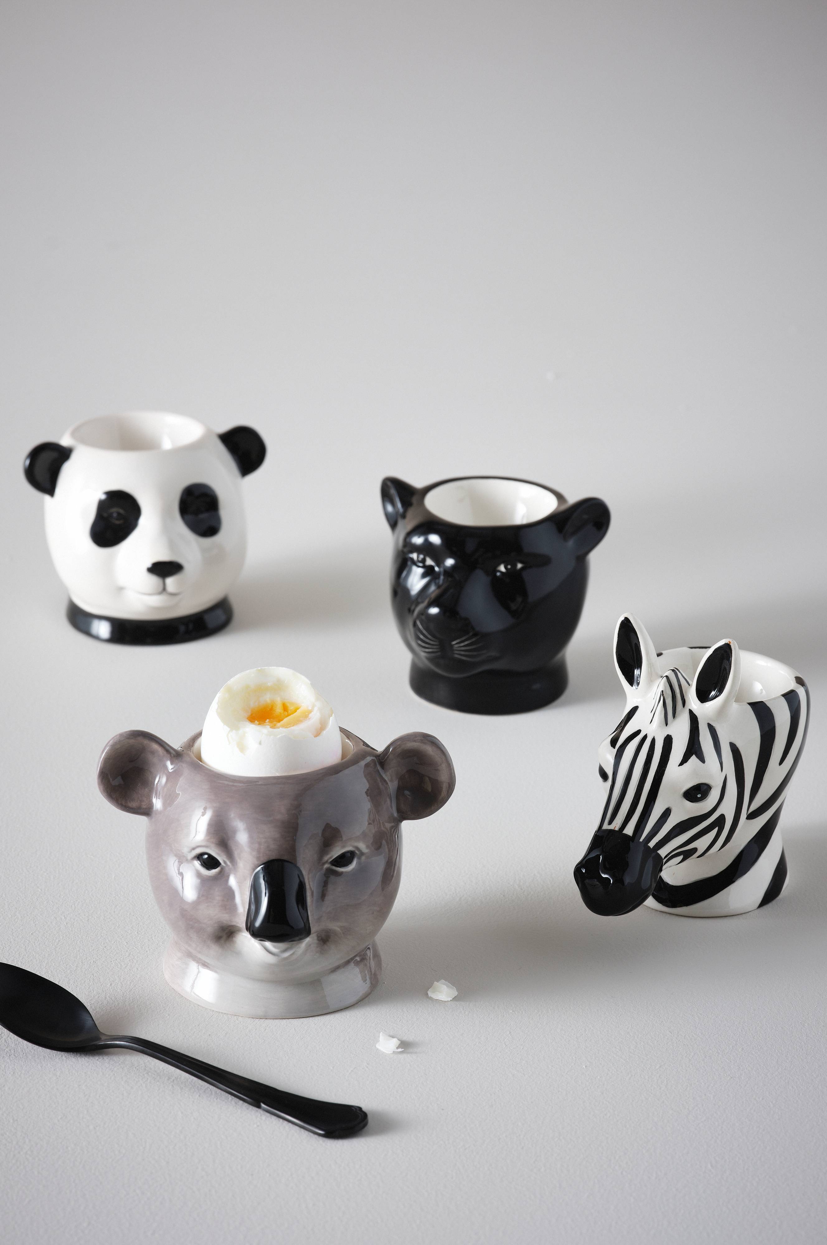 4-pak æggebægre i dolomitporcelæn. Æggebægrene har et spændende design, der forestiller forskellige dyr: en zebra, en koala, en panda og en panter.