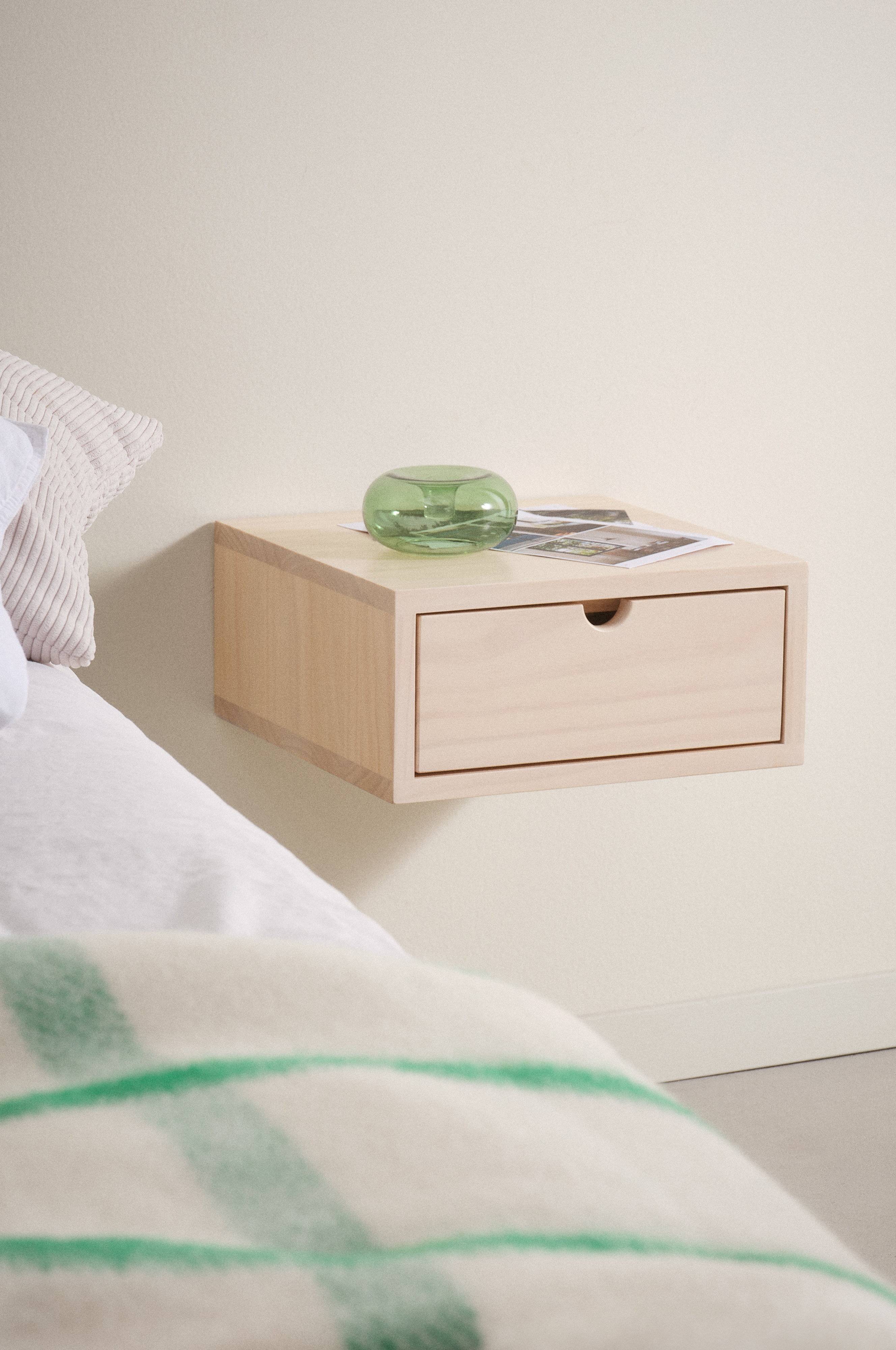 Væghængt sengebord af FSC-mærket fyrretræ som har fået en blød overflade. Sengebordet har en skuffe med fræst, halvrundt fingergreb. Praktisk liste til ophængning på væggen.