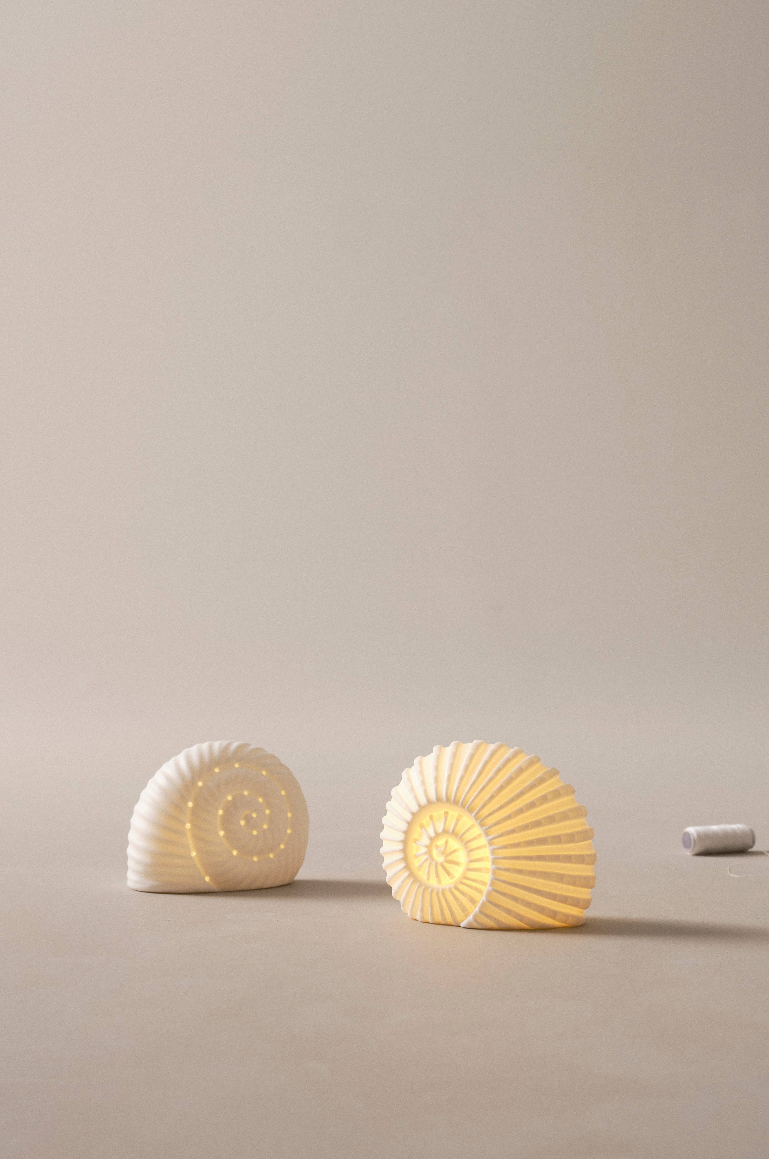 2-pak natlamper af porcelæn med LED-lys. De to lamper er sneglehusformede og let gennemsigtige, så de spreder et blødt og hyggeligt skær. De er perfekte at have tændt om natten, som et blidt vågelys eller til børn, der kan føle sig tryggere, fordi det er lidt tændt lys rundt omkring. Batteridrevet med en lille afbryder under lampen.