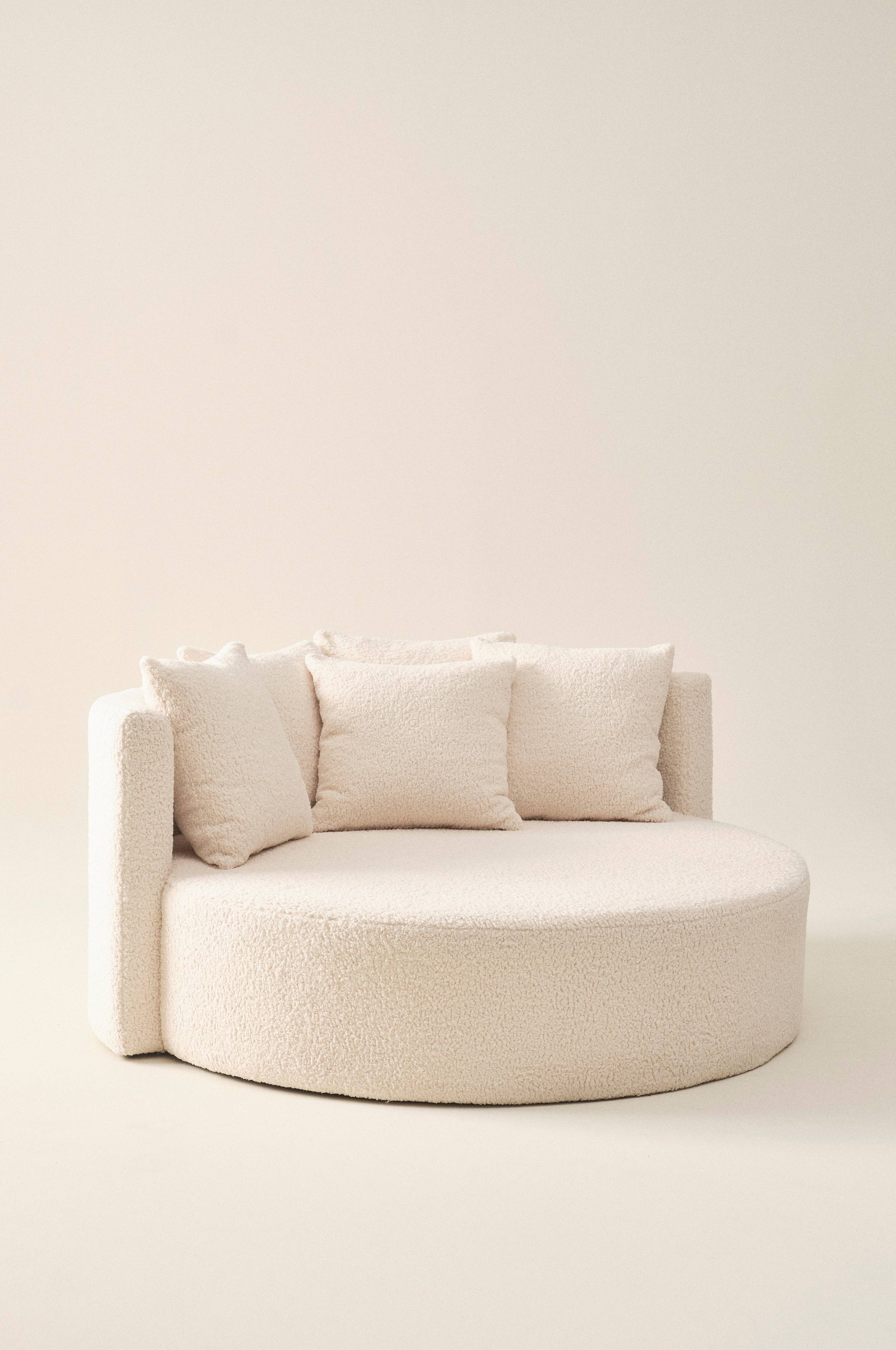 Rund sofa med blødt plysbetræk i polyester. WYOMING har et stabilt skelet af fyrretræ og plywood med god siddekomfort takket være den fantastiske opbygning af koldskum, zigzag-affjedring, elastikbånd og den skønne polstring af fjer og kuglefibre. Rygpuderne har polstring af fjer og kuglefibre, som gør dem behagelige at læne sig op af. Pudebetrækkene er aftagelige og har lynlås langs kanten forneden. Det robuste plysstof har en slidstyrke på 40.000 Martindale. WYOMING loveseat er hjemmets hyggeligste siddeplads, både for en og to personer! Den runde form og det bløde betræk gør sofaen ekstra indbydende.
