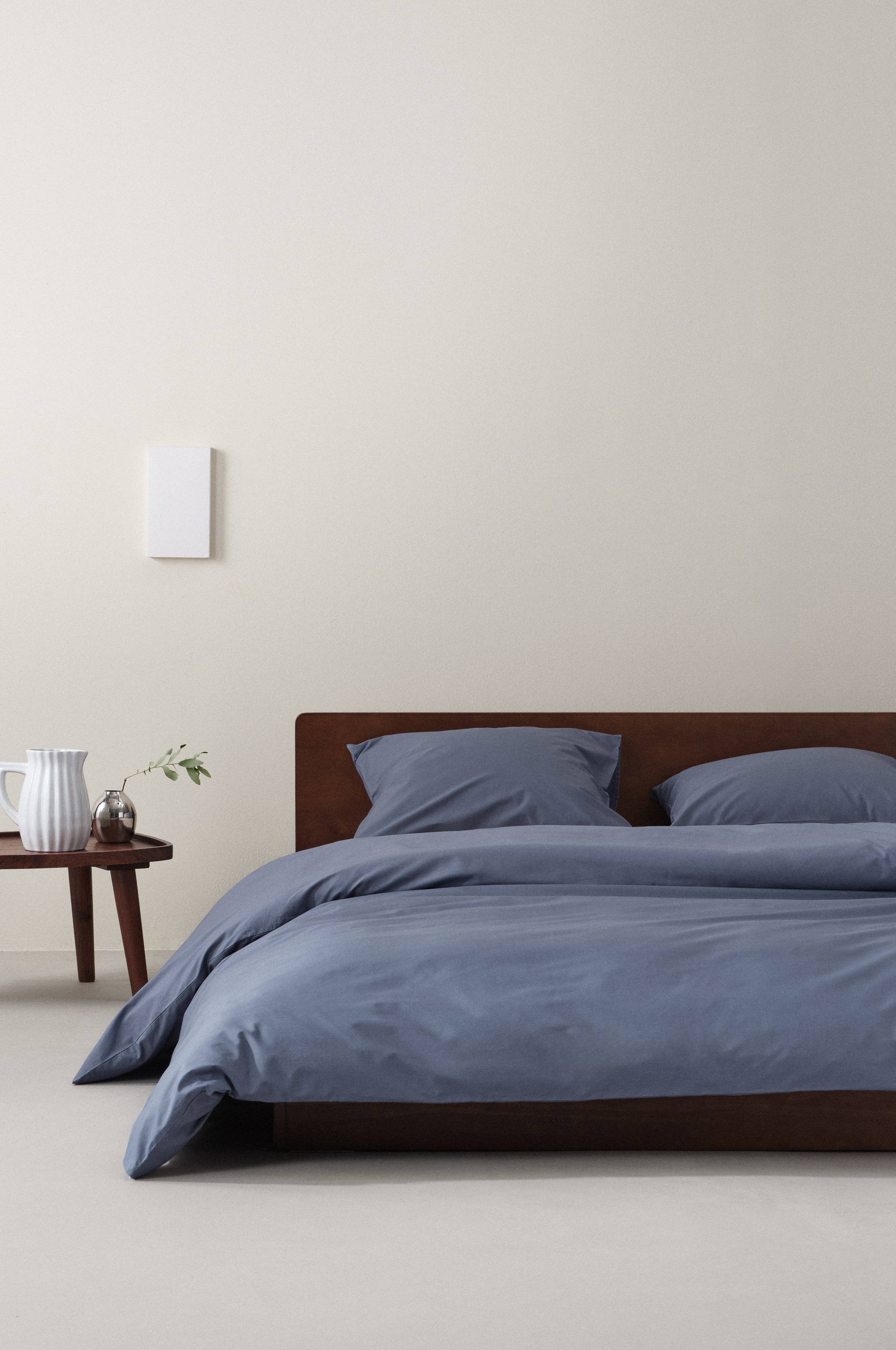 Enkeltfarvet tredelt dynebetræk, et ekstra bredt dynebetræk og to pudebetræk i lækker økologisk bomuldspercale. Percale er et ekstra blødt og behageligt stof, der er vævet med tynde, fine bomuldstråde.