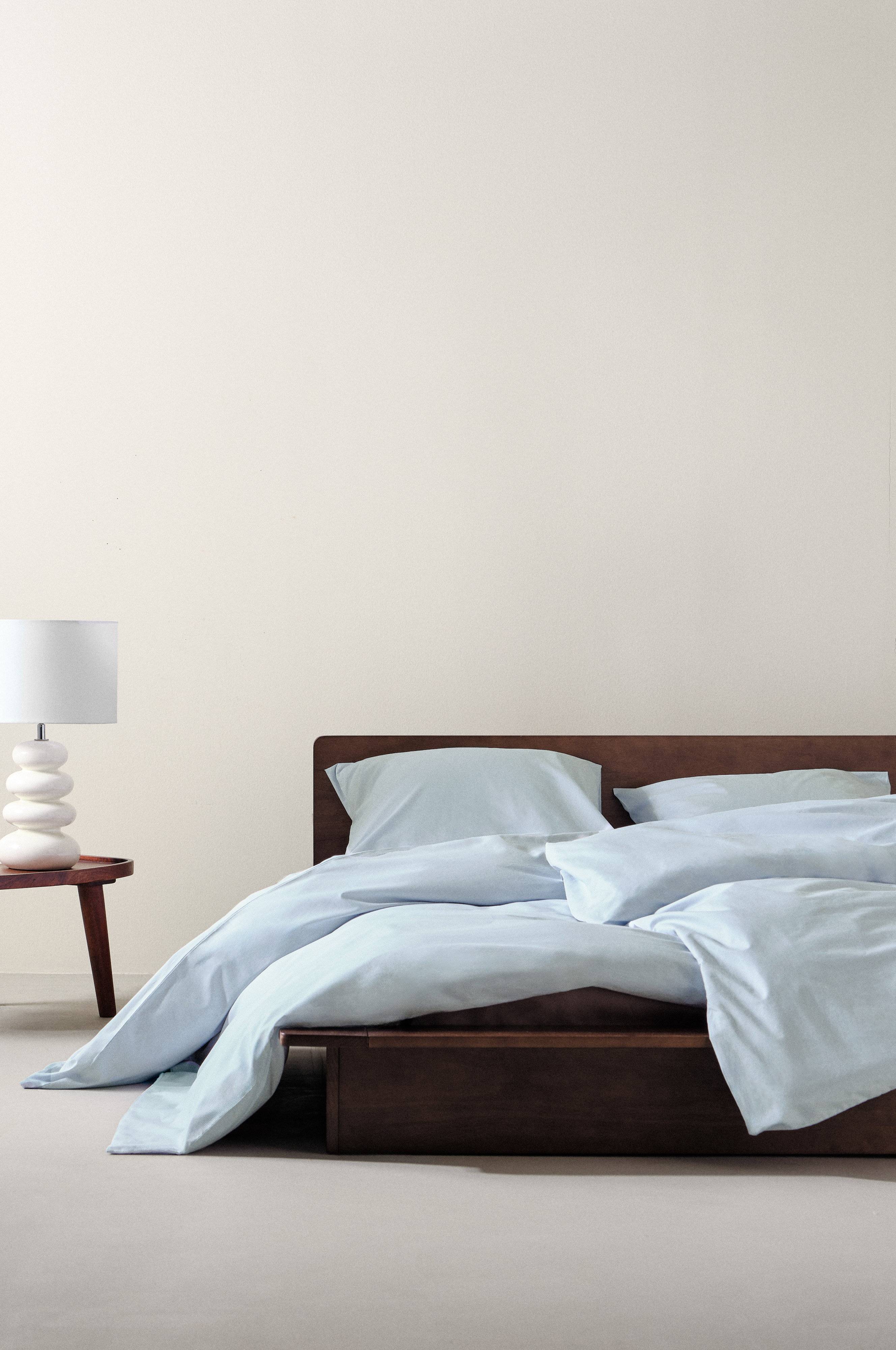 Ensfarvet sengesæt i to dele, et dynebetræk og et pudebetræk i vidunderlig percale af økologisk bomuld. Percale er et ekstra blødt og behageligt stof som er vævet med tynde, fine bomuldstråde. Åbning i de øverste hjørner på dynebetrækket, så det er nemt at trække dynebetrækket over dynen. Trådtæthed på 200 tc. (Trådtætheden angiver antal tråde, thread counts, pr. kvadrattomme i et stof. Jo højere trådtæthed desto højere kvalitet.)