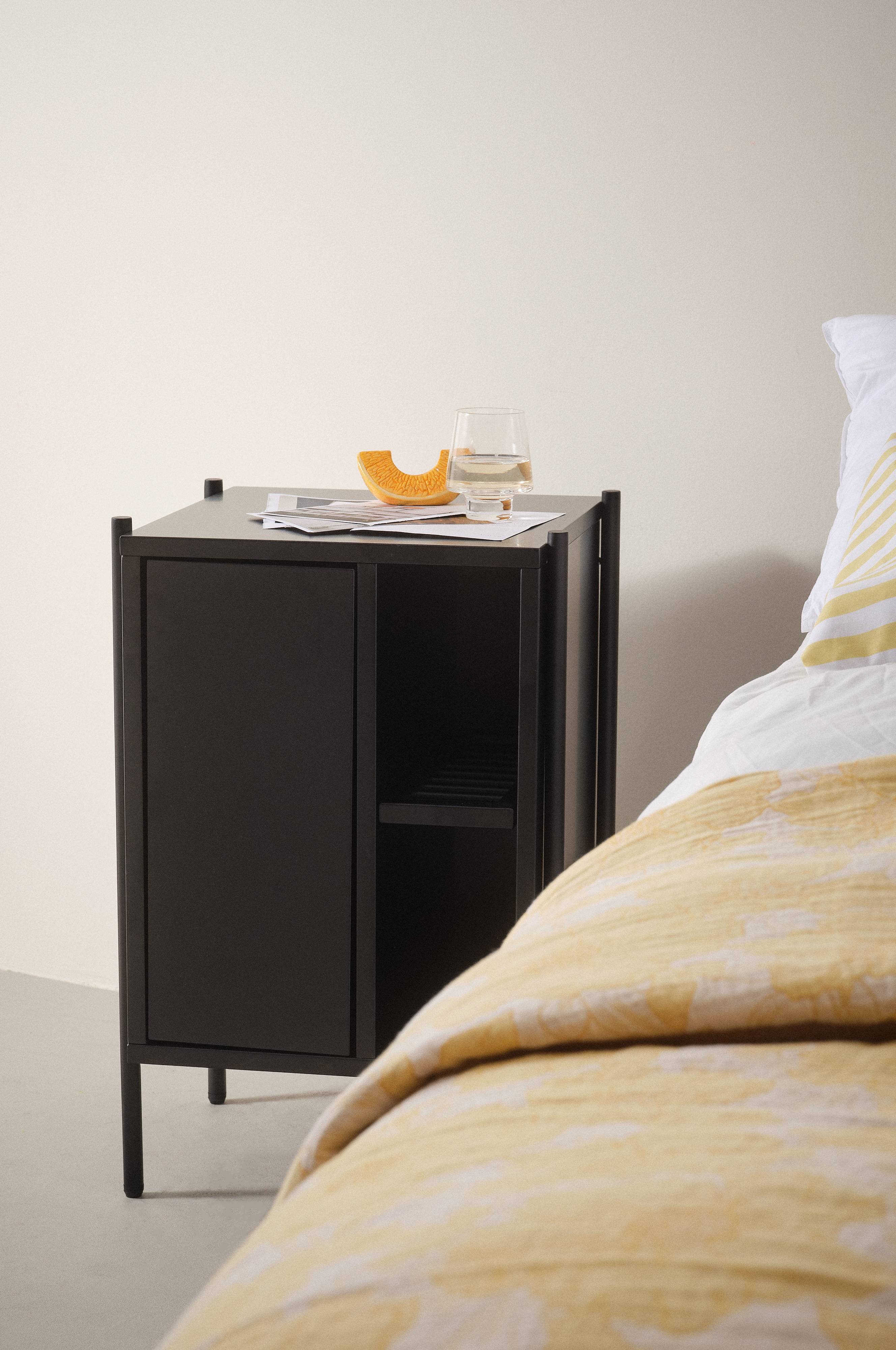 Sengebord i matlakeret MDF med matsorte ben af stål. Sengebordet ZOLLIK er tidløst i sit rene design. Skabet har en fast hylde - opbevaring der kan skjules bag flotte låger er praktisk. Lågerne har push-funktion. Skruer medfølger. Nogen montering kræves. Samlevejledning medfølger.