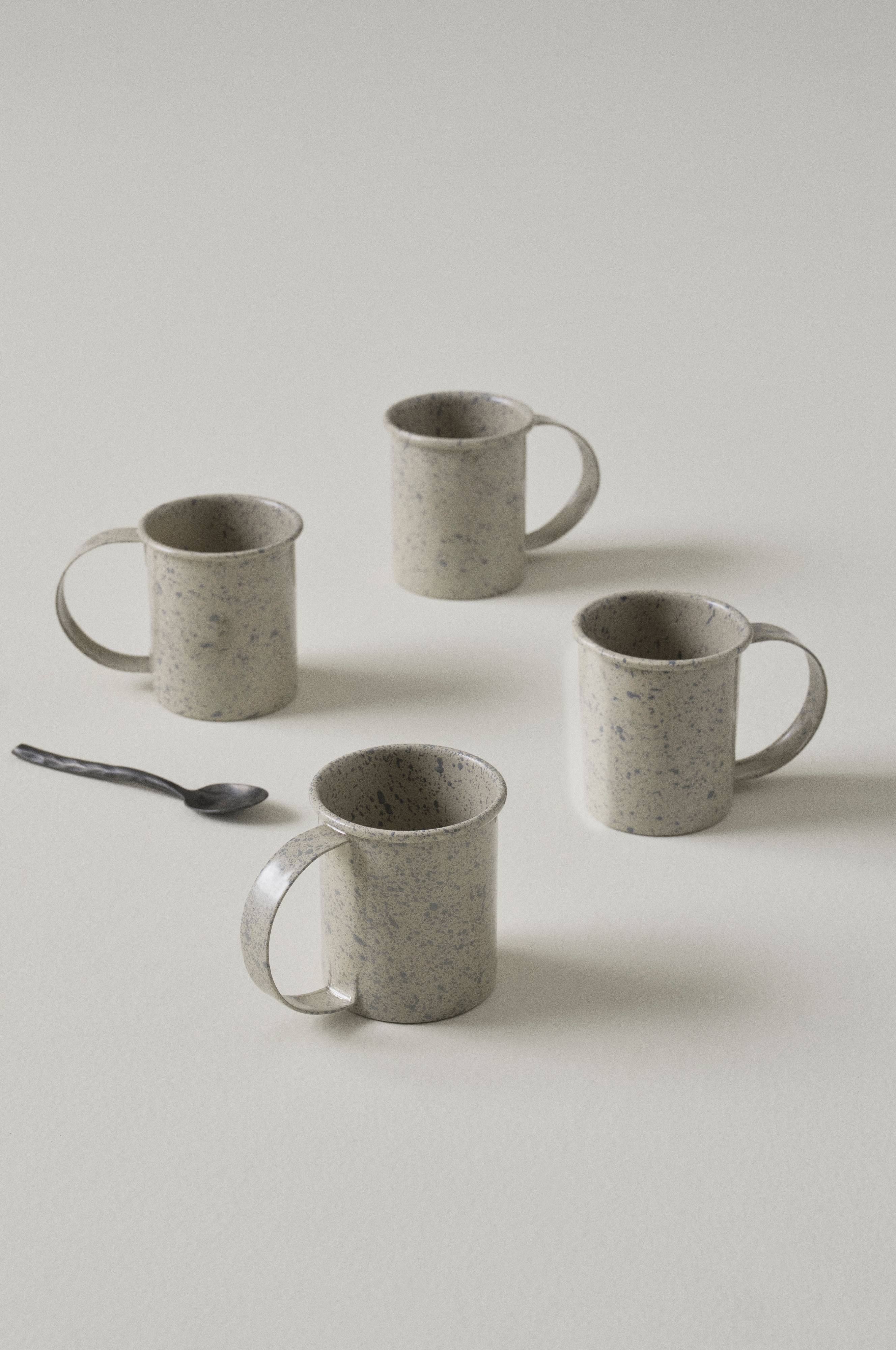 4-pak krus af metal med pulverlakeret overflade. Krusene har et skønt stænkmønster og fin glans, udtrykket minder om gamle emaljekrus. Kruset er lige i modellen med klassisk, rullet kant foroven og stor hank som giver et godt greb. Den rullede kant gør det behageligt at drikke af. Også indersiden er pulverlakeret og blank.